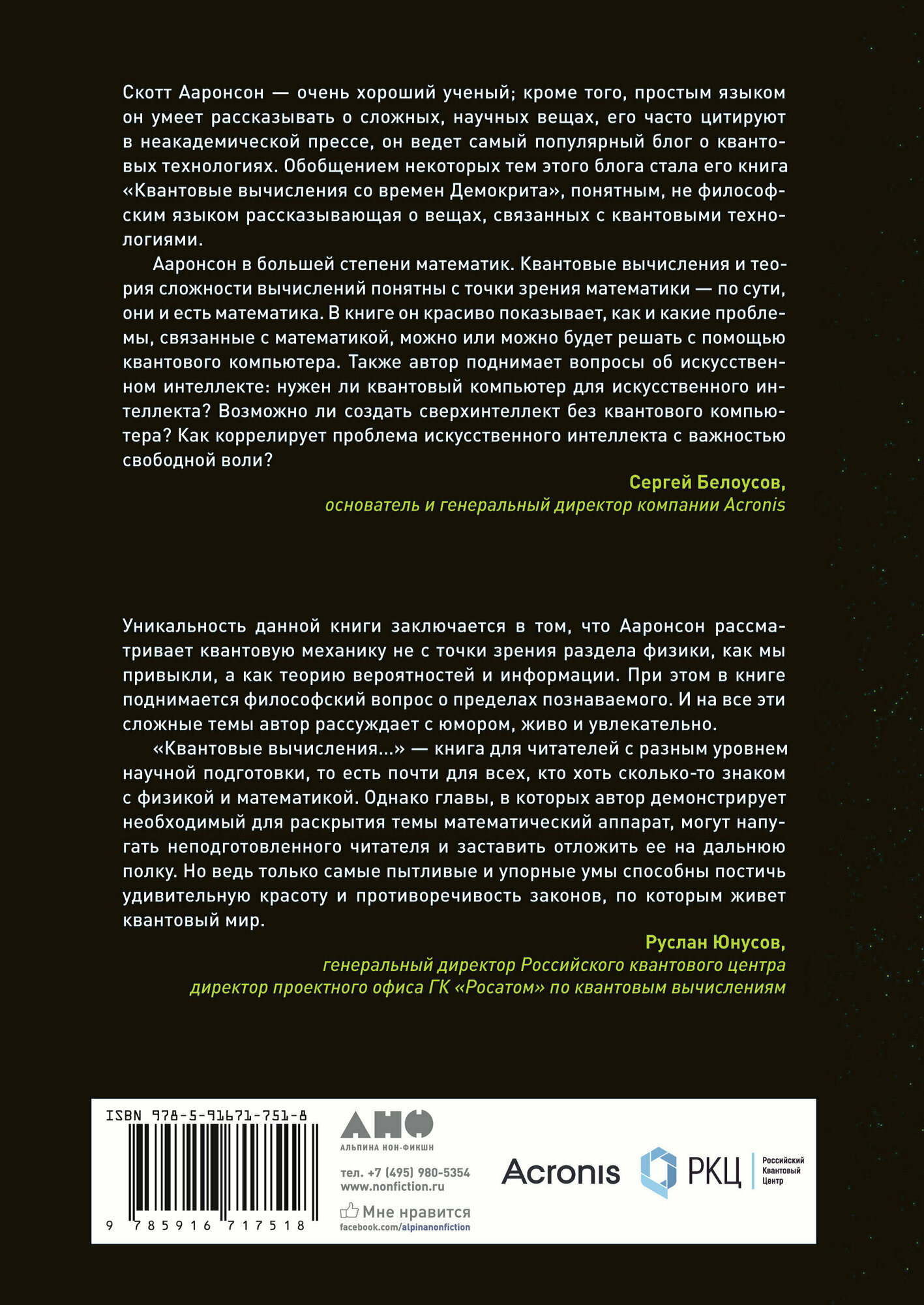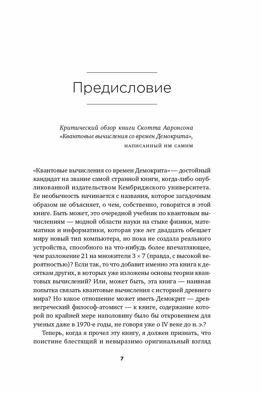 Описание книги Квантовые вычисления со времен Демокрита: Написанная известным теоретиком в области квантовых вычислений Скоттом Ааронсоном, эта книга проведет вас через поразительное разнообразие тем, исследуя самые глубокие идеи математики, информатики и физики от теории множеств, вычислительной сложности, квантовых вычислений до интерпретации квантовой механики. Кроме того, вы познакомитесь с дискуссиями относительно путешествий во времени, парадокса Ньюкома, антропного принципа и взглядов британского физика и математика Роджера Пенроуза. Неформальный стиль Ааронсона делает эту поразительную книгу доступной для читателей с научной подготовкой, а также для студентов и исследователей, работающих в области физики, информатики, математики и философии.