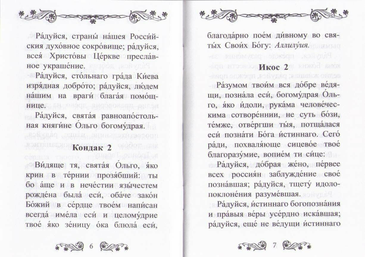 Данное издание содержит акафист, посвященный великой княгине Ольге. Святая равноапостольная великая княгиня Ольга, одна из первых на Руси принявшая крещение, почитается Русской Православной Церковью как духовная матерь русского народа, покровительница Отечества и ходатаица о всех русских людях.