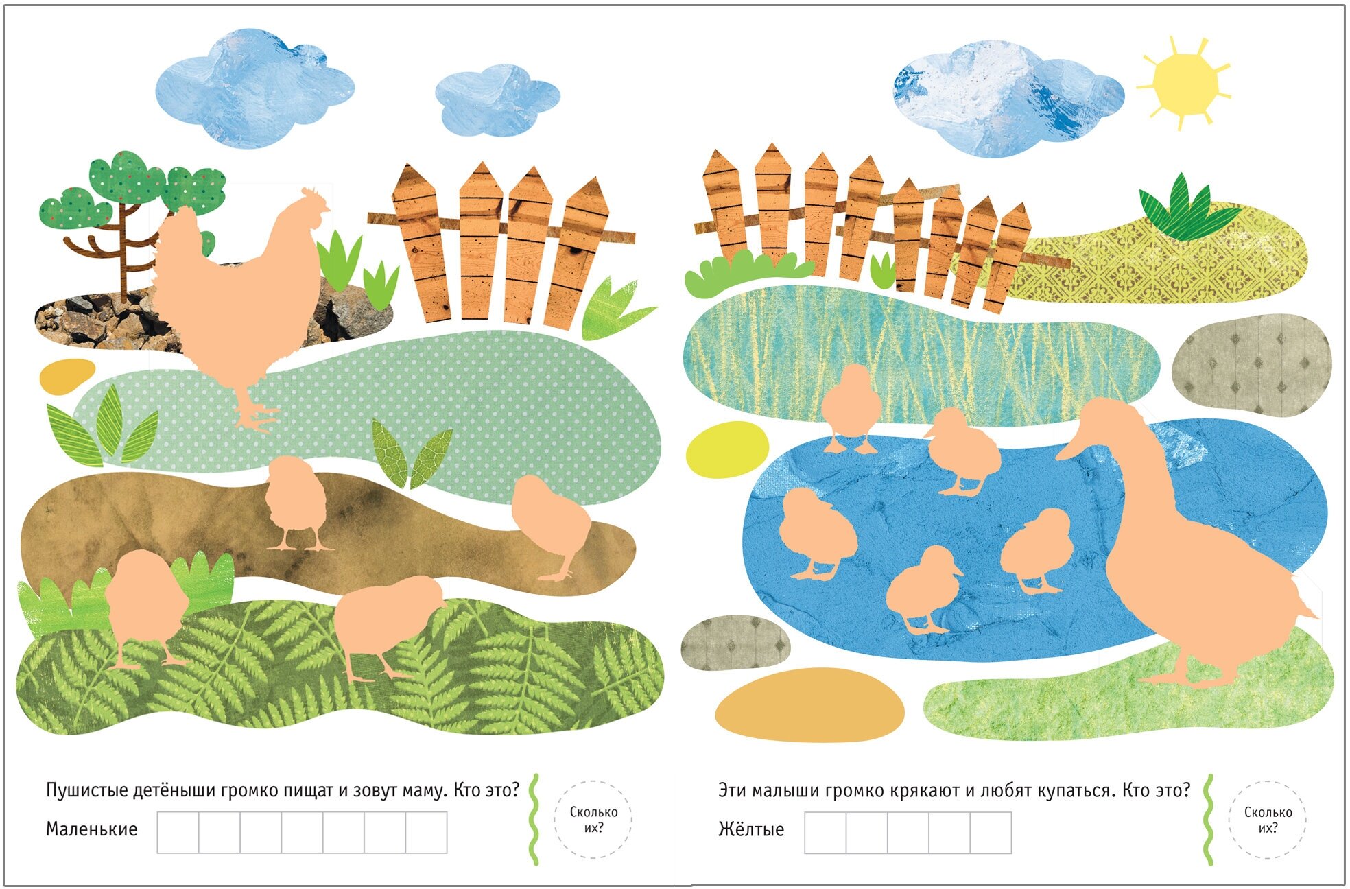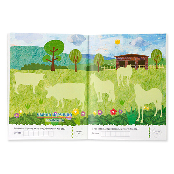 Задача ребенка - правильно распределить их по страницам и ответить на вопросы. Сделать это будет несложно благодаря подсказкам.