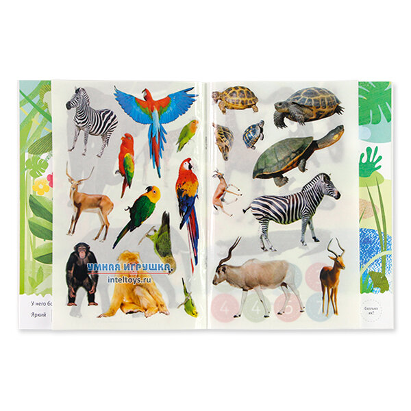 .На красочных страницах чего-то не хватает. Оживить их помогут фотонаклейки с изображениями животных.