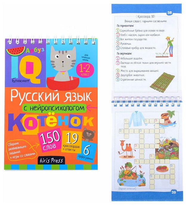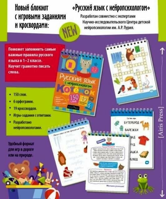 Котенок-отдедный блокнот по русскому языку на запоминание написания слов и правильности, таких как театр, жонглёр, класс, заяц. Слова сопровождаются картинками, некоторые только не очень детские и теплые. Блокнот содержит задания для заполнения кроссвордов: место где зимуют полярники, проявлять резвость. В общем и целом некоторые задания и формулировки не для второго класса, в нашем случае таких было много, на помощь пришли родители.