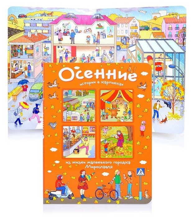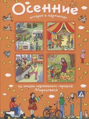 Книга рассказывает об одном осеннем дне из жизни маленького городка Мирославля. Его жители спешат по своим обычным делам, а с некоторыми происходят разные забавные приключения. В книге почти нет текста, но «читать» её можно бесконечно. Это прекрасное пособие для обучения детей рассказу по картинкам. Оно разовьёт воображение, речь, пространственное мышление и восприятие, обогатит словарный запас вашего ребёнка. Книга предлагает различные темы, на которые можно поговорить с детьми, а также занимательные задания к каждому развороту.Для детей разного возраста, от малышей до школьников.Более 50 персонажей на каждом из 5 разворотов.13 тем для обсуждения с ребёнком.7 заданий к каждому развороту - найди, сосчитай, назови.9 заданий для развития речи, внимания, памяти, пространственного мышления и восприятия.Для детей от 3 лет.