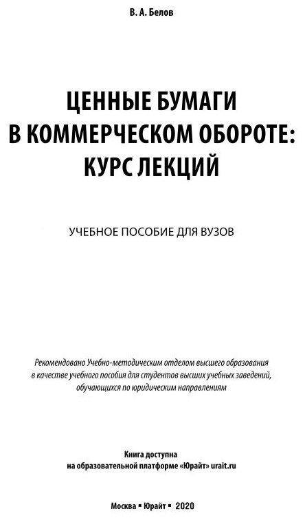 Ценные бумаги в коммерческом обороте: курс лекций. Учебное пособие (Вадим Анатольевич Белов); ЮРАЙТ, 2018