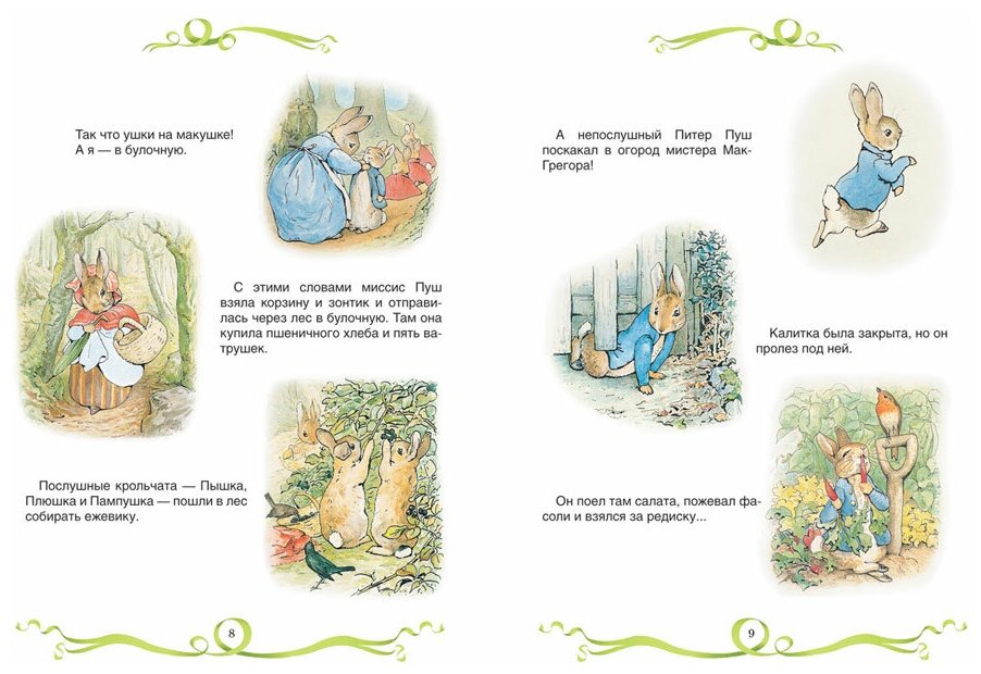 Идеальная книга для малышей 3-4 лет. В книге много маленьких рисунков, поэтому ребенку не надоедает долго слушать текст. Местами сказки немного жестоки. Например, история папы кролика Питера, которого запекли в пирог, вызвала у малыша много вопросов (как запекли? зачем? кто его съел?), да и вообще эта книга описывает мир полный опасностей для маленьких зверушек. Но может быть это и не плохо, должно же у городского ребенка формироваться адекватное представление о реальном мире. Издание довольно неплохое, хорошая обложка, качественная бумага и замечательные иллюстрации, нежные, красивые, с большим количеством мелких деталей. Именно из-за рисунков мне эта книга изначально и приглянулась. Купила ее спонтанно, сама с книгами автора ранее знакома не была, но покупка оказалась очень удачной, ребенок каждый день просит почитать про кролика Питера.