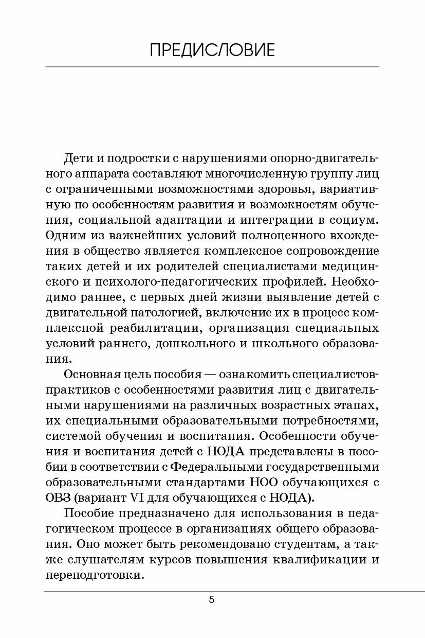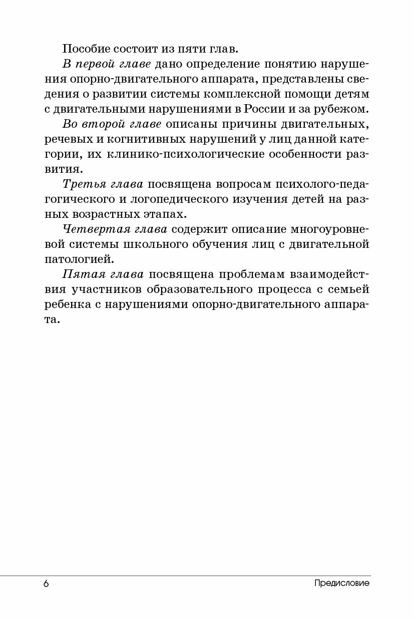 В пособии представлены сведения из истории становления системы помощи лицам с двигательными нарушениями в России и зарубежом; клинико-психолого-педагогические особенности детей раннего, дошкольного и школьного возраста с нарушениями опорно-двигательного аппарата; направления, содержание и технологии психолого-педагогического сопровождения, обучение и воспитание детей данной категории на разных возрастных этапах, особенности сопровождения семей, воспитывающих детей с двигательной патологией.