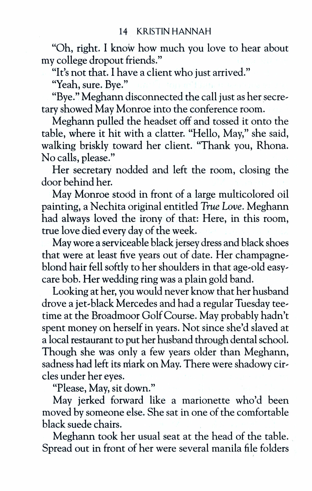 We all make mistakes, but for Meghann Dontess the terrible choice she made some years ago cost her everything, including the love of her sister, Claire. Meghann is now a highly successful attorney, and has put all thoughts of love completely behind her – until she meets the one man who believes he can change her mind.Claire has fallen in love for the first time in her life, and as her wedding day approaches she prepares to face her strong-willed older sister. Reunited after two decades, these two women who believe they have nothing in common will try to become what they never were: a family.Tender, funny, bittersweet and moving, Kristin Hannah's Between Sisters skilfully explores the profound joys and sorrows shared in a close relationship, the mistakes made in the name of love, and the promise of redemption.