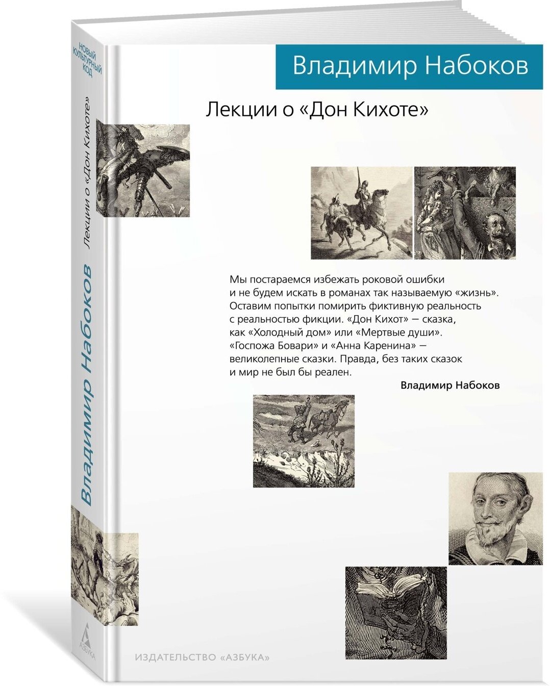 Цикл лекций о знаменитом романе Сервантеса «Дон Кихот», прочитанный крупнейшим русско-американским писателем XX века Владимиром Набоковым в Гарвардском университете в 1952 году и изданный посмертно отдельной книгой в 1983-м, дополняет лекционные курсы по русской и зарубежной литературе, подготовленные им ранее для студентов колледжа Уэлсли и Корнеллского университета. Всегда с удовольствием оспаривавший общепринятые мнения и избитые истины, Набоков-лектор представил произведение Сервантеса как «грубую старую книжку», полную «безжалостной испанской жестокости», а ее заглавного героя — не только как жертву издевок и унижений со стороны враждебного мира, но и как мишень для скрытой читательской насмешки. При этом, по мысли Набокова, в восприятии последующих поколений Дон Кихот перерос роль жалкого, беспомощного шута, изначально отведенную ему автором, и стал символом возвышенного и святого безумия, олицетворением благородного одиночества, бескорыстной доблести и истинного гуманизма, сама же книга прератилась в «благонравный и причудливый миф» о соотношении видимости и реальности. Проницательный, дотошный и вызывающе необъективный исследователь, Набоков виртуозно ниспровергает и одновременно убедительно подтверждает культурную репутацию Дон Кихота — «рыцаря печального образа», сложившуюся за четыре с половиной столетия.