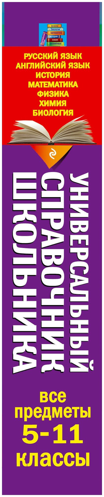 В универсальном справочнике школьника представлена полная информация по основным школьным предметам: русскому языку, истории, английскому языку, математике, физике, химии и биологии.