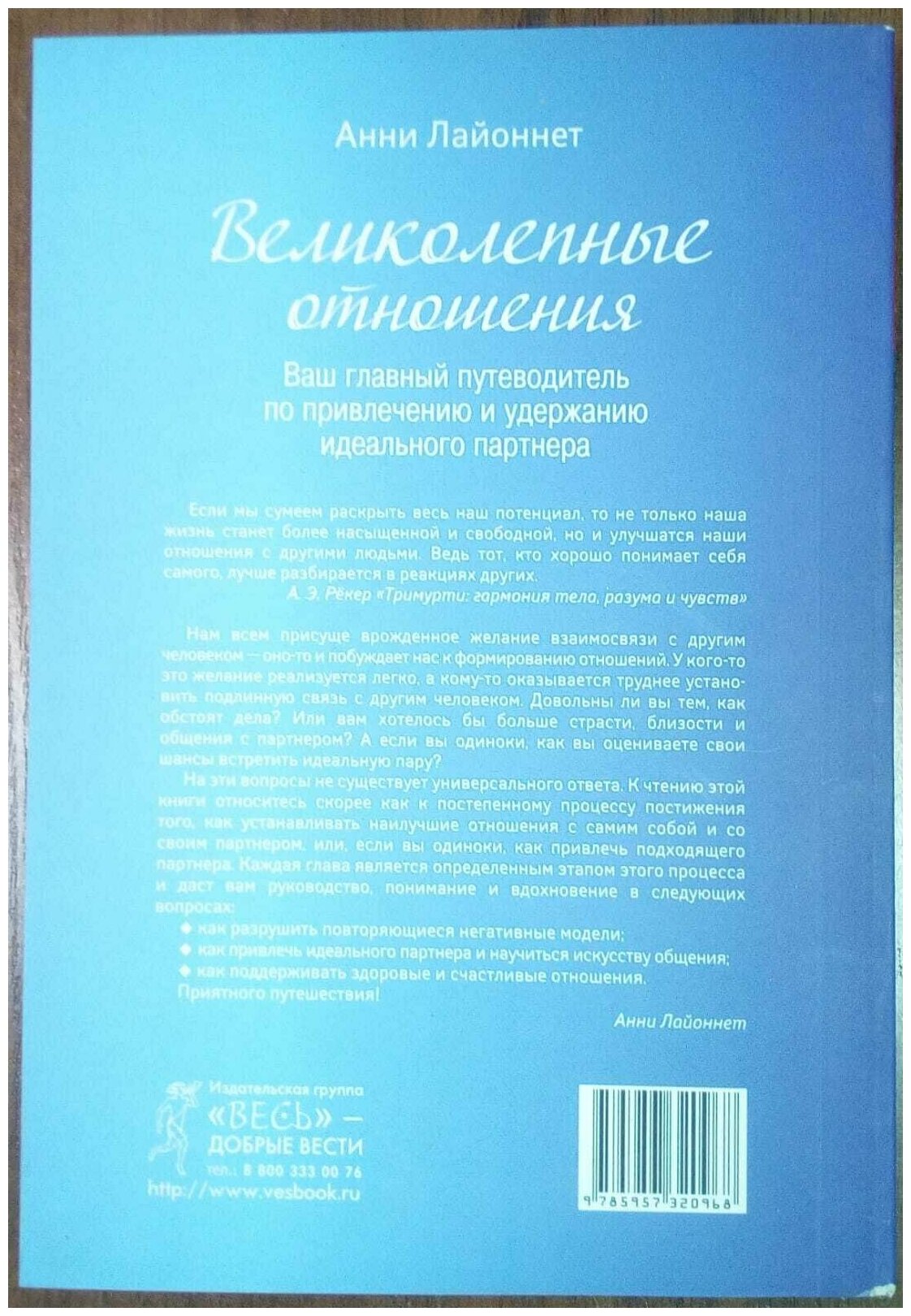 .Какой бы ни была ваша личная история, книга "Великолепные отношения" послужит вдохновляющим путеводителем, который приведет вас к успеху в любви. Анни Лайоннет рассказывает о девяти этапах установления великолепных отношений. Пройдя их, вы сможете привлечь идеального партнера, узнаете, как овладеть искусством общения и установить равновесие в отношениях, а также научитесь поддерживать баланс и гармонию в своей личной жизни.