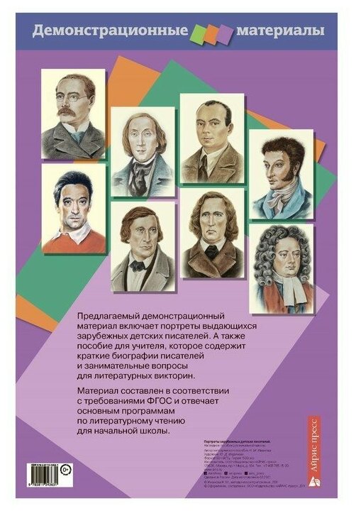 Предлагаемый демонстрациооный материал включает портреты выдающихся зарубежных детских писателей. А также методические рекомендации, которые содержат краткую биографию писателей и занимательные вопросы для литературных викторин. Материал составлен в соответствии с требованиями Государственного образовательного стандарта.