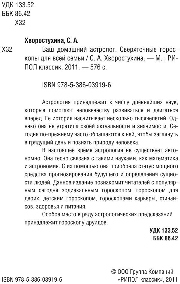 Ваш домашний астролог Сверхточные гороскопы для всей семьи (Светлана Хворостухина); РИПОЛ Классик, 2011