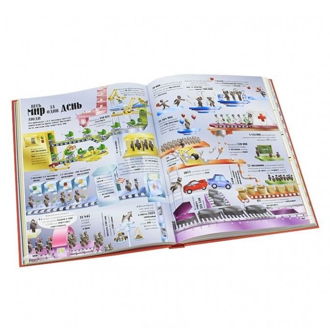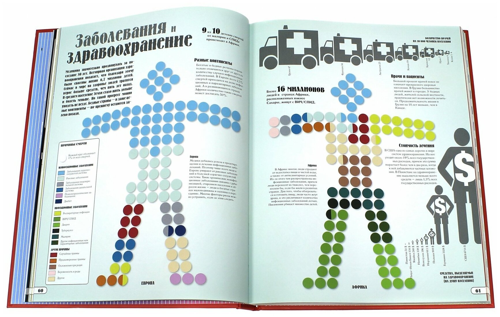Единственный недостаток это цена. Во всём остальном - не к чему придраться. Шикарная книга, выполненная на глянцевой бумаге, содержит 250 страниц, буквально нашпигованных информацией. Причём сведения подаются в иллюстрированно-сравнительном виде, благодаря чему откладываются в голове в виде яркого образа. Например, количество отходов на душу населения показано в виде мусорных баков, соответствующих значению каждой страны. Или вот производство шоколада-сладкая плитка поделена на части, соответствующие стоимости затрат каждого участника шоколадного бизнеса.Я для себя узнал, что при стоимости шоколадки в 44 рубля, поставщик какао получит только 3 рубля. Что такое ООН, и что в него входит, где что празднуют, причины смертности, размеры военных бюджетов, количество полицейских на 100 000 человек и многое многое другое. Очень понравился график зависимости человеческого счастья от уровня доходов, с размещёнными на нём 135 странами. Деньги деньгами, но книга безумно интересна для всех возрастов.