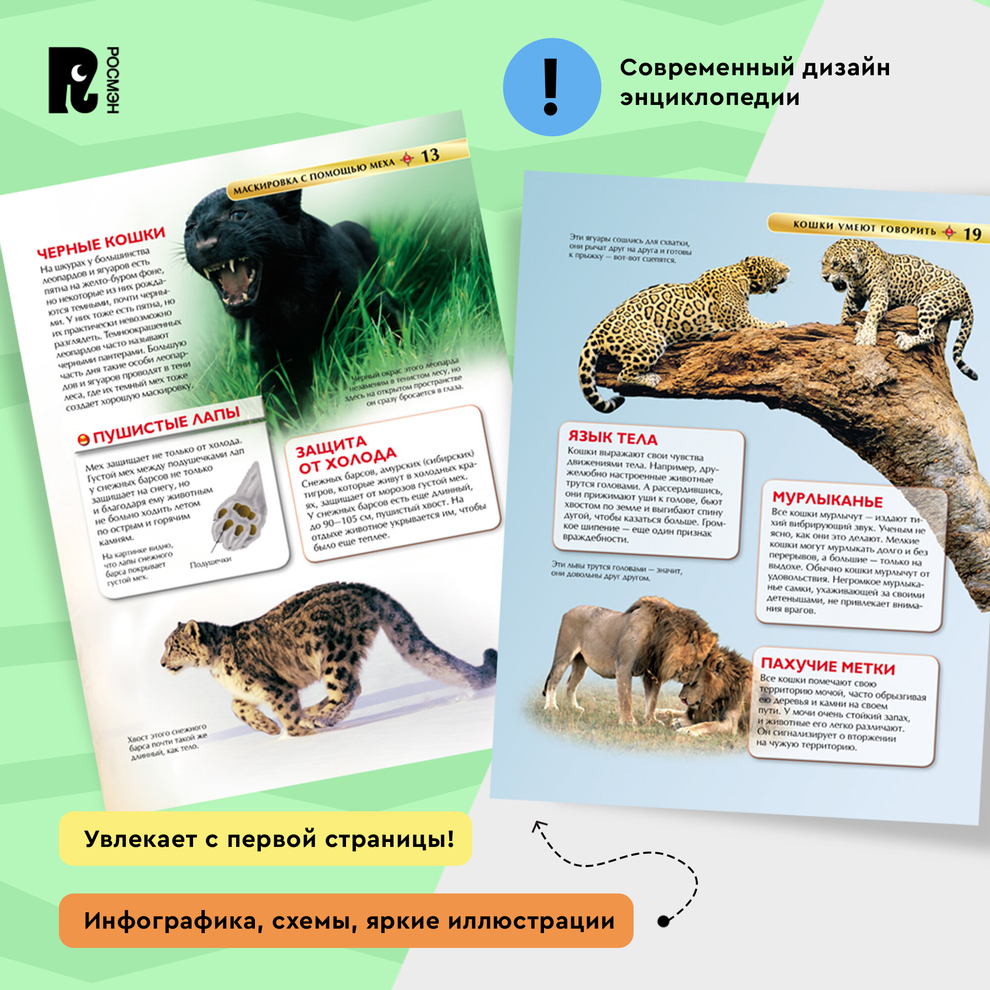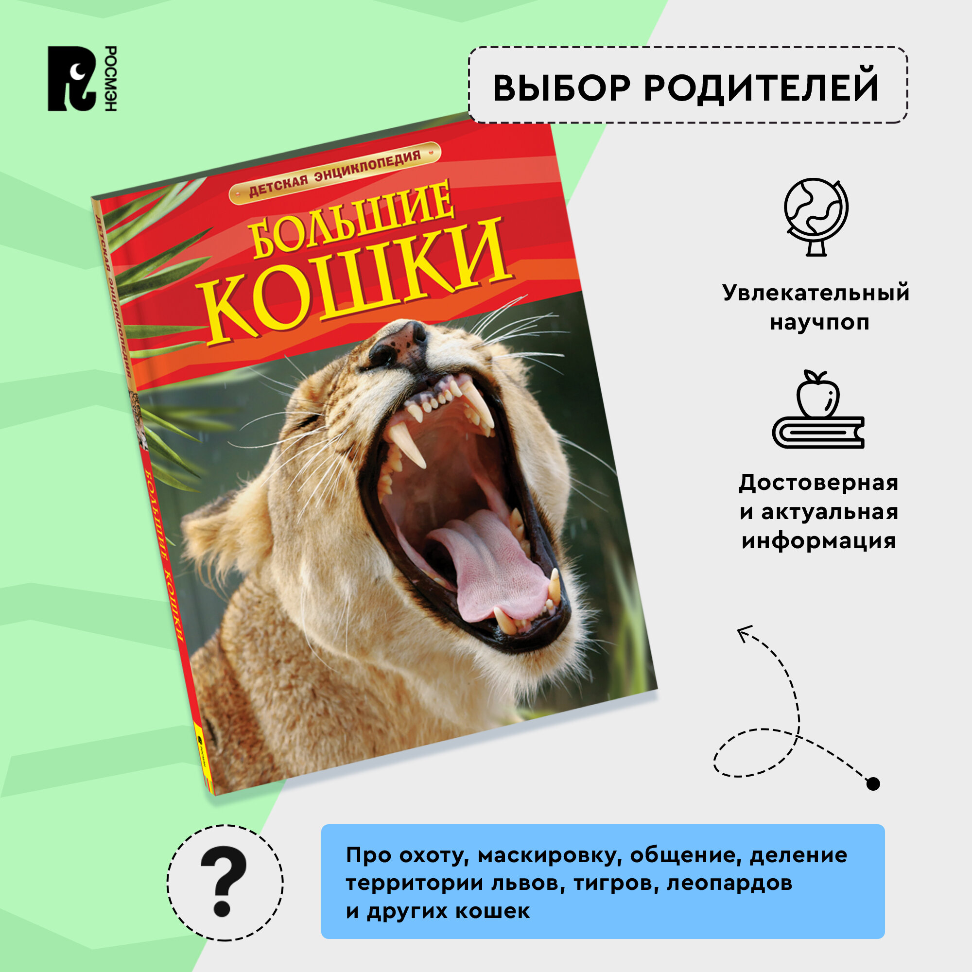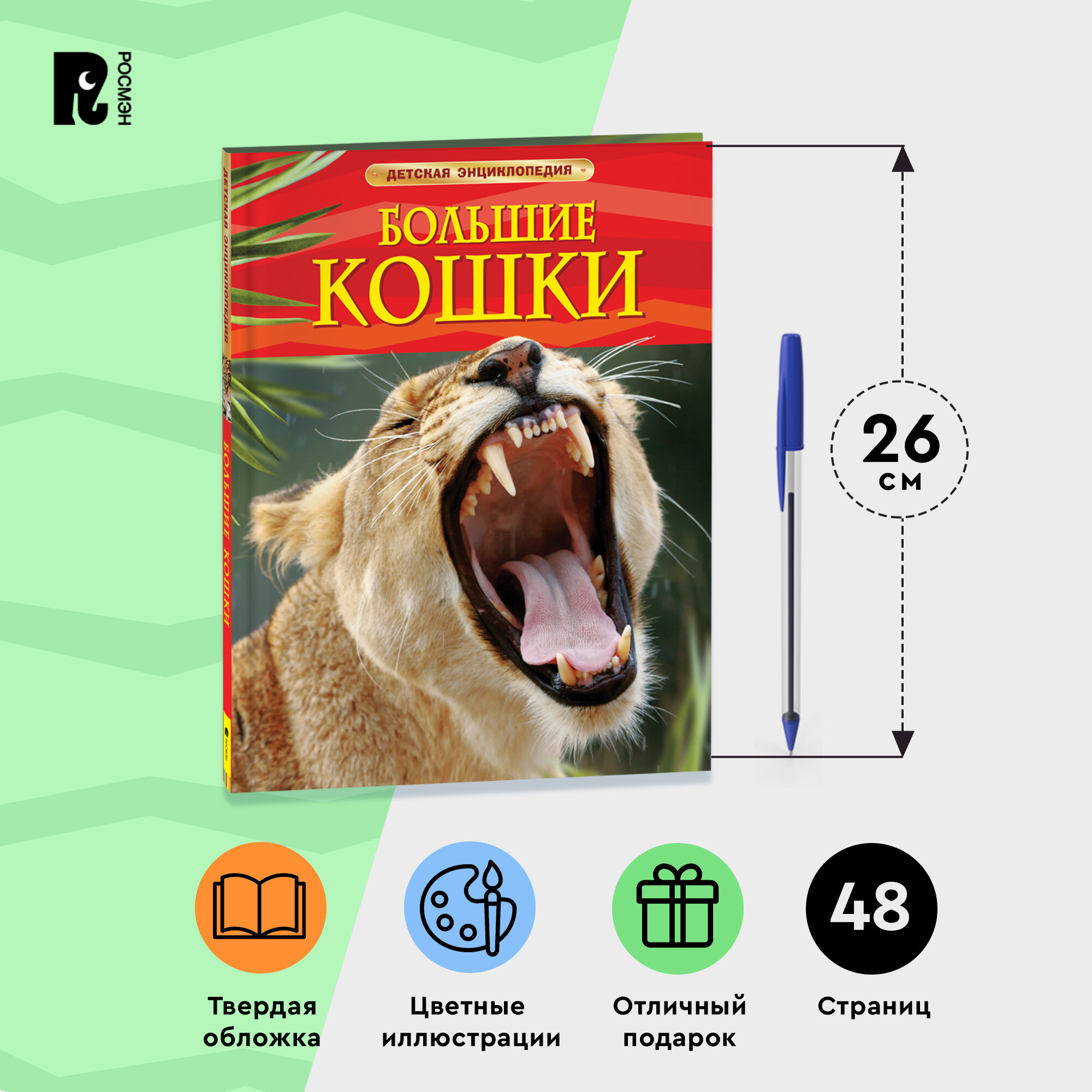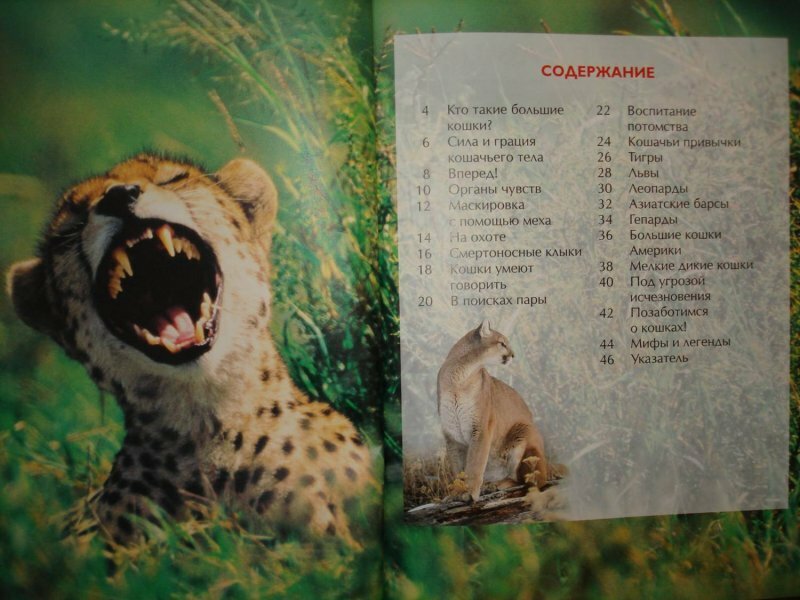 Отличное издание для среднего школьного возраста, но деткам помладше будет также интересна. Красочная и содержательная книга о крупных кошках (львах, тиграх и т.д). В книге также рассматриваются и моменты из их жизни, как они охотятся, маскируются в дикой природе, воспитывают потомство, о привычках и органах чувств, которые кошки используют. В каждом разделе не только информация, но и качественные, красочные фотографии каждого вида. Книга небольшая, всего 48 страниц, отлично подойдет в качестве подарка любопытному школьнику. Твердый переплет, плотная белая бумага, крупный шрифт, сочные, яркие иллюстрации. Отличное качество за невысокую стоимость.