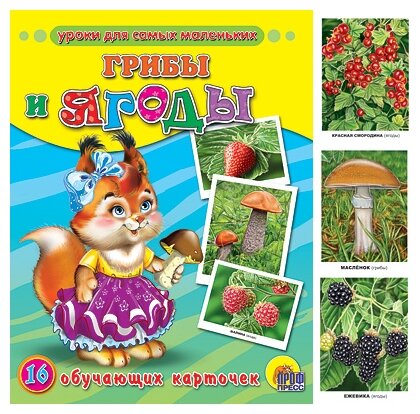 Грибы и ягоды. Уроки для самых маленьких. 16 обучающих карточек. Учебное пособие для дошкольников.