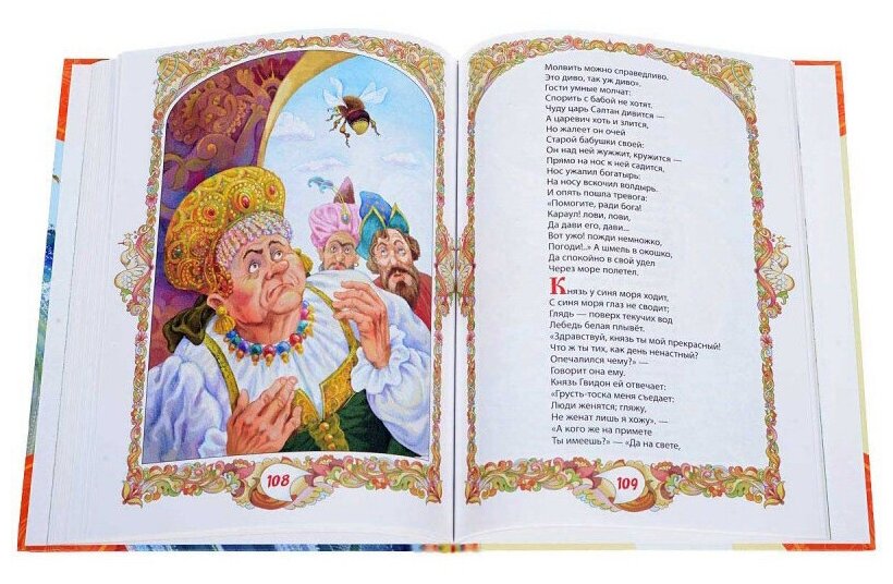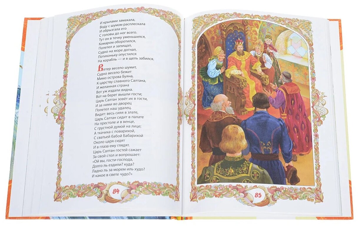 Собраны все самые известные сказки Пушкина. Иллюстрации Лебедева понравились, их много, почти на каждой странице, плюс на каждой странице окантовка. Очень приятное издание, страницы не очень плотные, не много просвечивают, но за эту цену не критично, шрифт довольно комфортный для чтения. Возьму еще что-нибудь из этой серии