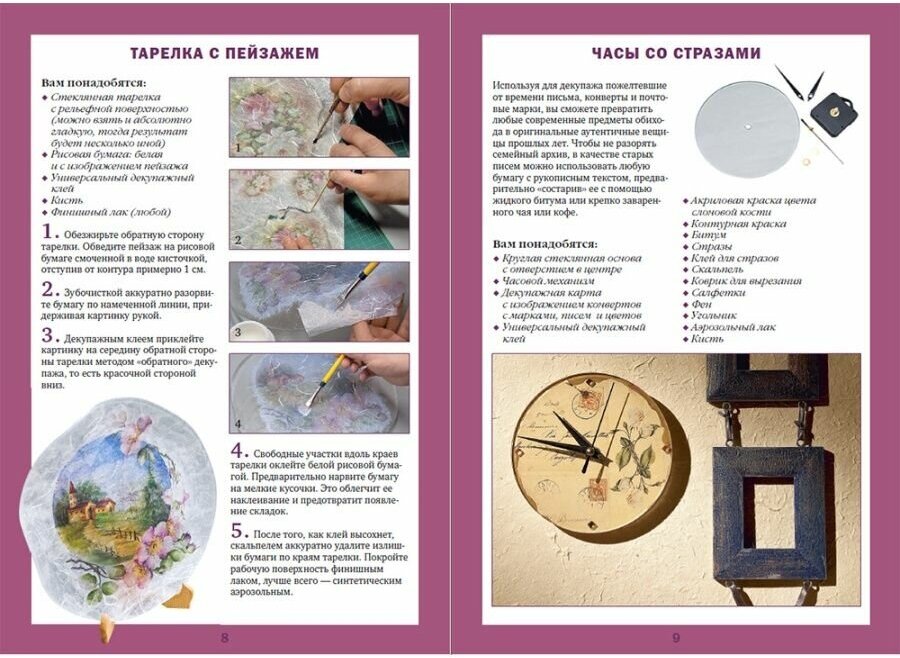Декупаж — это техника украшения различных поверхностей вырезанными из бумаги изображениями. Под слоем лака такие аппликации выглядят словно роспись. Обратный декупаж применяется для отделки прозрачных стеклянных поверхностей: посуды, предметов интерьера и т. д. Чтобы стеклянные предметы не только красиво выглядели, но и остались функциональными, все действия выполняются в обратной последовательности с обратной стороны стекла. О тонкостях обратного декупажа рассказывает в своей книге известный литовский дизайнер Светлана Юсель.