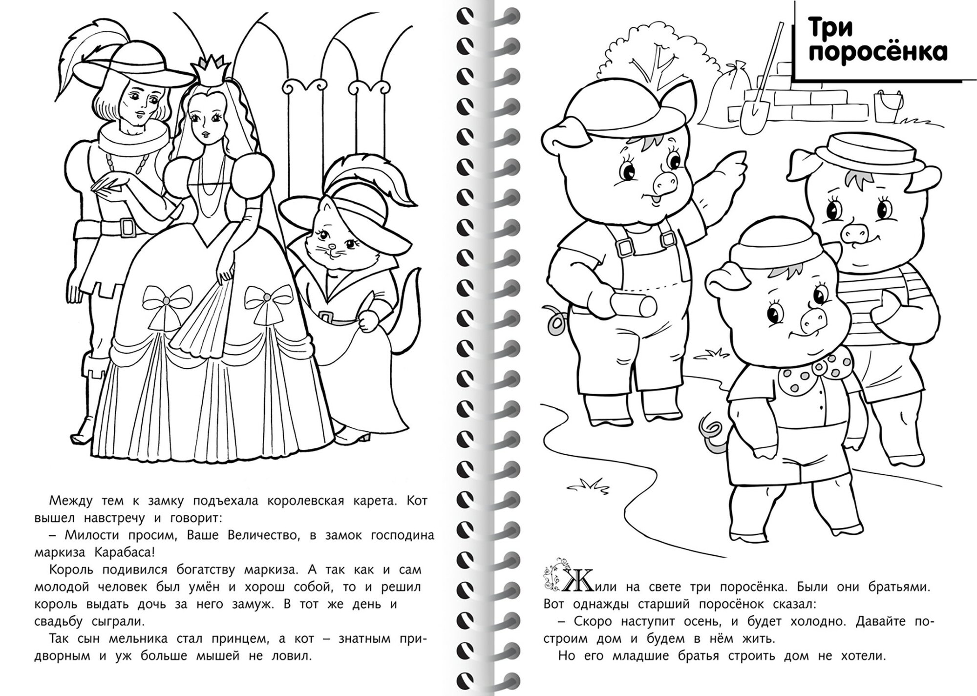 Кроме картинок для раскрашивания содержит тексты сказок.