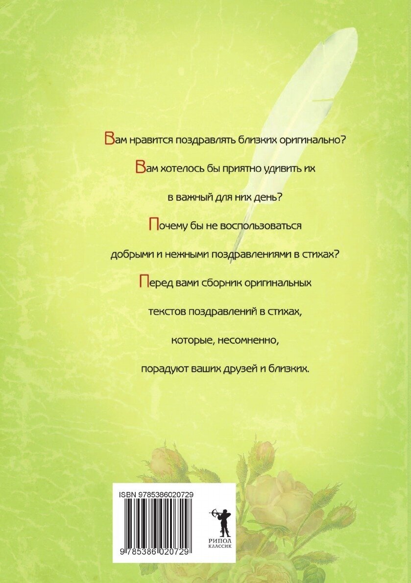 Поздравить любимых и близких людей со знаменательными событиями? Написать добрые и ласковые поздравления в стихах? Все это возможно, если вы воспользуетесь текстами поздравлений, приведенными на страницах данной книги.