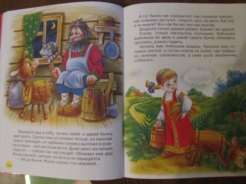 Здравствуйте дорогие читатели. Сегодня получили с ребенком замечательную книгу "Большая книга русских сказок". Книга очень качественная: обложка и переплет твердые, страницы напечатаны на плотной матовой бумаге, книга очень яркая и красочная. Текст и картинки располагаются пропорционально. Очень понравились сами тексты сказок! Тексты не переделанные, такие какими они были в детстве. Рекомендую эту книгу всем читателям!!!
