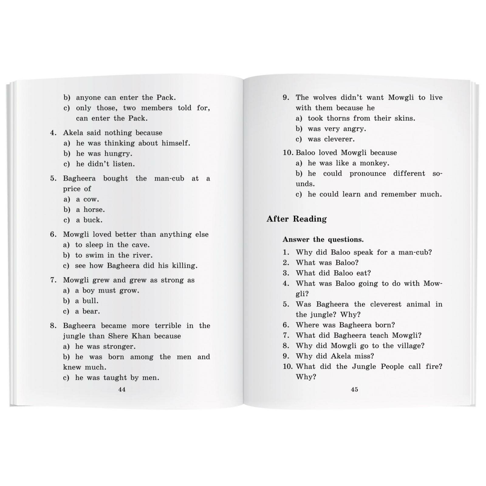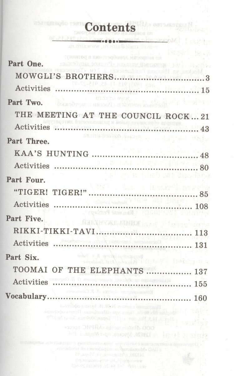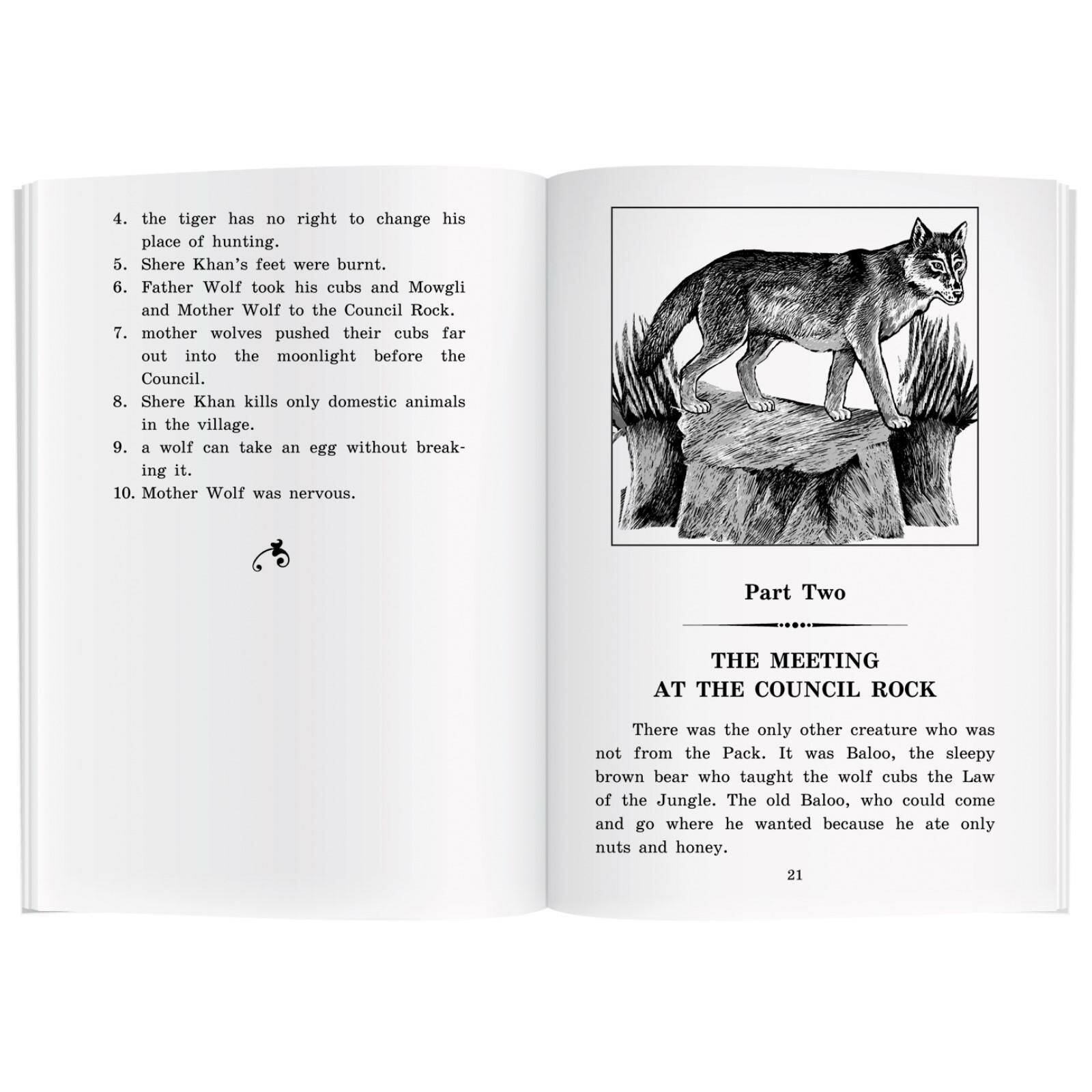 Отличная книга. Читал с интересом и удовольствием. Текст предешьно понятен. Большую часть книги удалось прочесть не прибегая к словарю. В данной книге вмего шесть частей,тно не надо думать что это мало. Части довольно продолжительные, интересны и хорошо адаптированы под уровень. После кпждой чксти есть задания доя самоконтроля, что будет очень полезно для школьников, и читателей, которые любят проверять себя после чтения. На мой взгляд книга будет хороша для классного чтения в школе или в качестве факультатива. В книге собраны рассказы о знакомом всем нам Маугли, храбром Рикки-Тикки-Тави и юнном ловце слонов, которому удалось увидеть столь редкий танец последних. Всем рекомендую!