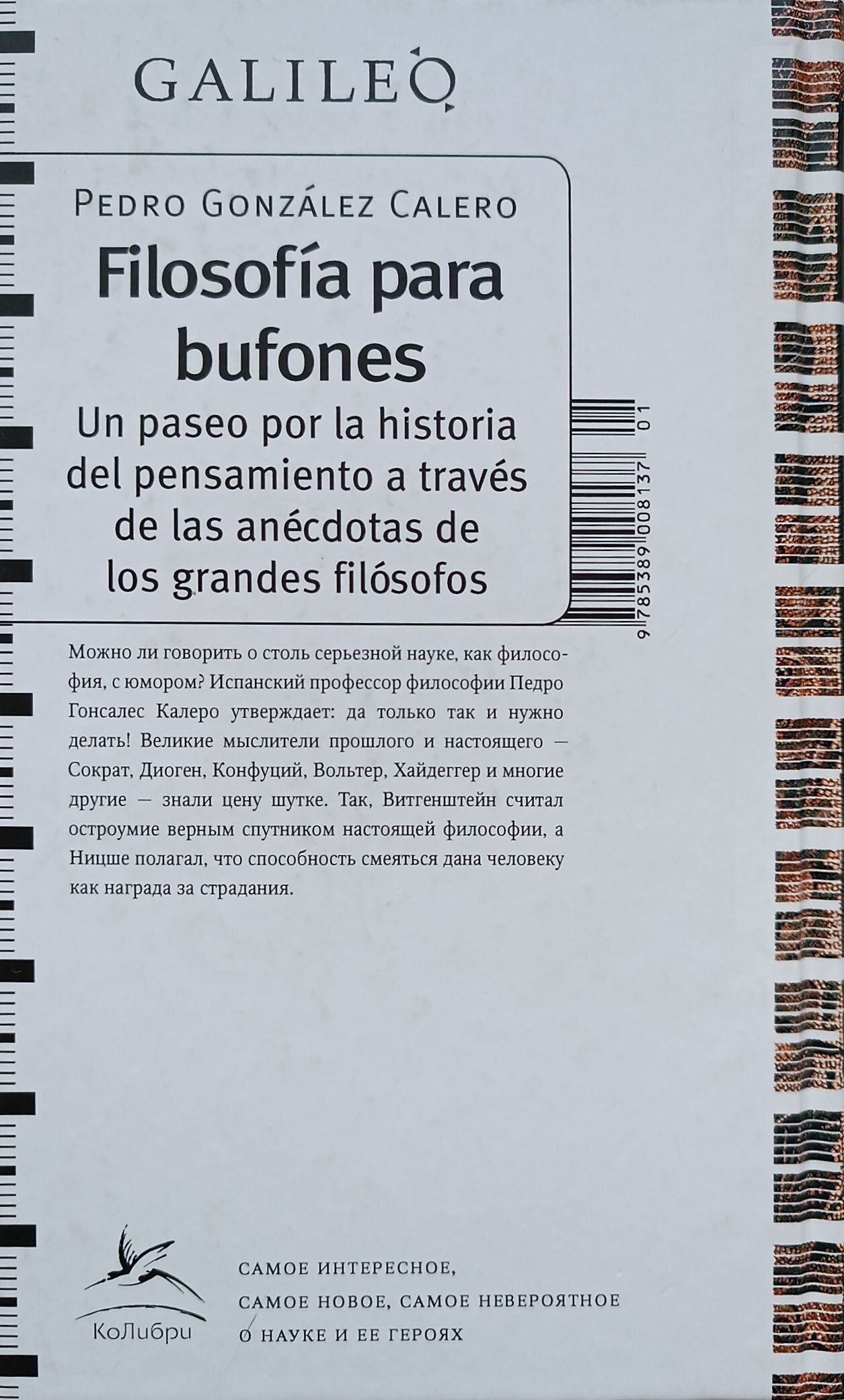В своей веселой и при этом глубокой книге испанский ученый и писатель Педро Гонсалес Калеро рассказывает об истории философии, о том, над чем смеялись философы, и о том, как смеялись над ними самими. Он приглашает читателя в увлекательное путешествие во времени и пространстве, в гости к Диогену, Конфуцию, Вольтеру, Дидро, Расселу, Хайдеггеру и другим мыслителям прошлого.