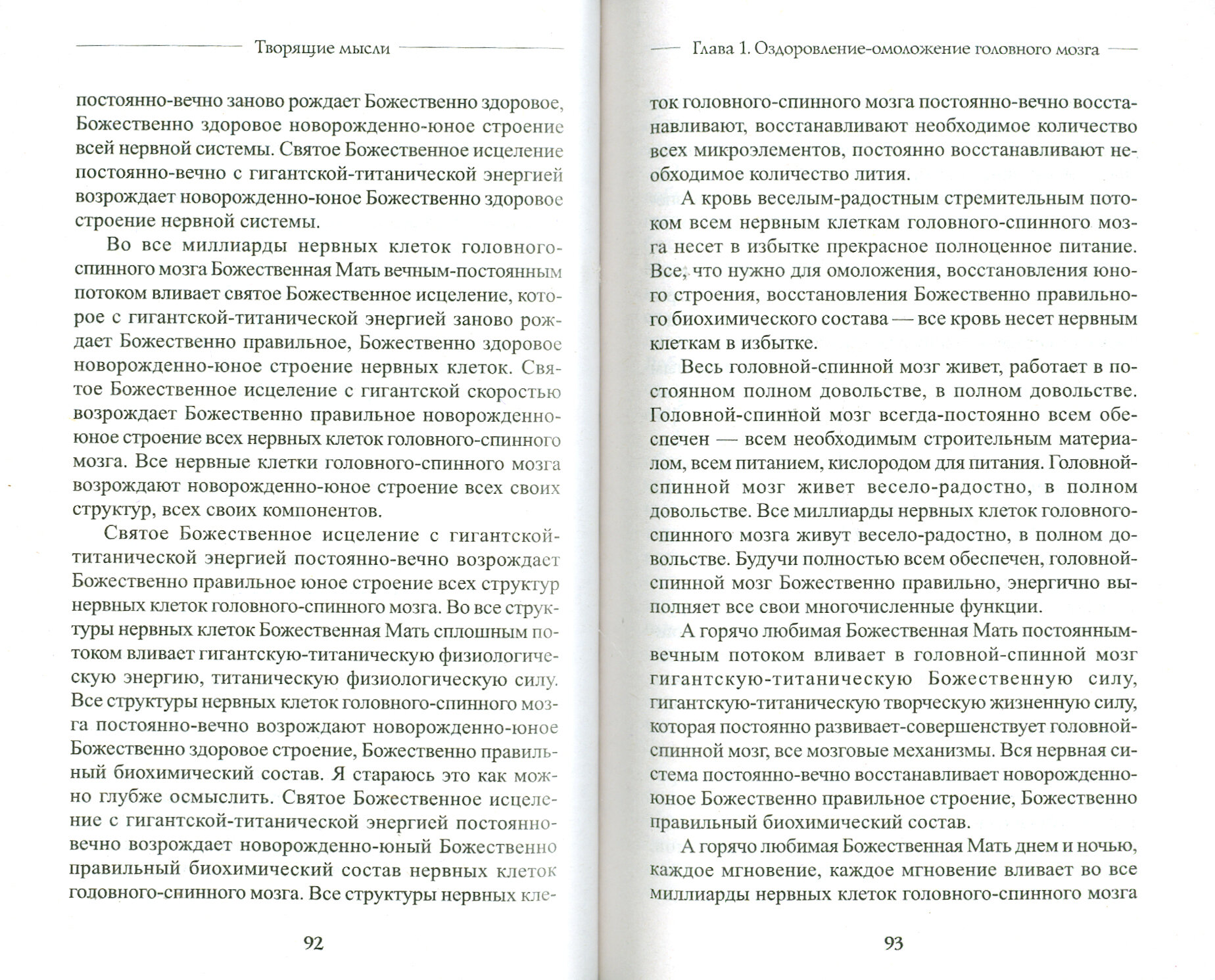 С глубоким уважением отношусь к работам Георгия Сытина. В 90-е году случайно наткнулась на его книгу "Животворящая сила. Помоги себе сам" в библиотеке отца. Прочувствовала, проверила на себе (была достаточно трудная жизненная ситуация для меня) и достигла желаемого результата. И потом в круговороте жизни абсолютно забыла о методе и настроях Сытина. Случайно наткнулась на фамилию автора и т.к. не нашла книги, которую читала раньше, решила заказать 2 книги данного издания "на пробу" (Развитие Божественных способностей и Создание молодой нервной системы). И ОЧЕНЬ ПОЖАЛЕЛА. Если бы не моё прежнее знакомство с методикой - после прочтения данных книг точно решила бы, что это очередная "оздоровительная" ерунда, с претензией на эксклюзивность, которых очень много печатается в последнее время. Во вступительной части (которая одинакова во всех книгах данной серии)- надерганные куски текста, непоследовательная подача материала. Хотя все основные принципы методики изложены. К самим настроям, приведенным в книгах, отношение нейтральное, но есть одно существенное замечание - настрои приведены в основном в мужской интерпретации (юноша, 190 см красавец-богатырь и т.д.), хотя ранее у Сытина все настрои были построены т.о., что не было явно указано на пол (кроме настроев, составленных именно для мужчин или женщин) и автоматически меняя только окончания глаголов и прилагательных я не напрягаясь адаптировала их в женский вариант.