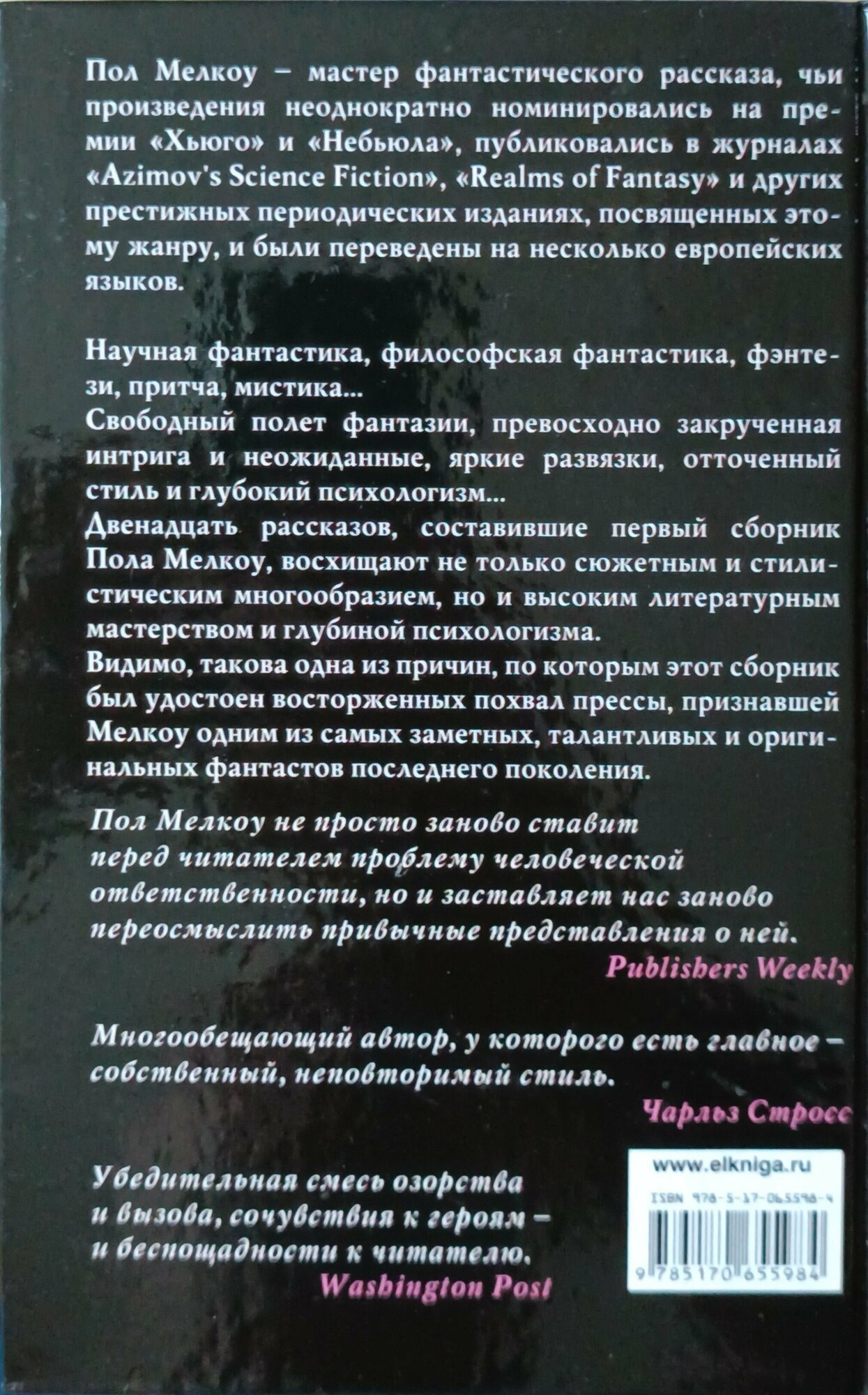 Научная фантастика, философская фантастика, фэнтези, притча, мистика… Свободный полет фантазии, превосходно закрученная интрига и неожиданные, яркие развязки, отточенный стиль и глубокий психологизм… Двенадцать рассказов, составившие первый сборник Пола Мелкоу, восхищают не только сюжетным и стилистическим многообразием, но и высоким литературным мастерством и глубиной психологизма. Видимо, такова одна из причин, по которым этот сборник был удостоен восторженных похвал прессы, признавшей Мелкоу одним из самых заметных, талантливых и оригинальных фантастов последнего поколения.