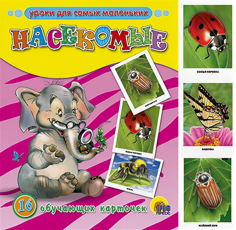 Карточки очень понравились, хороший формат, удобная обложка. Карточки изготовлены из картона средней плотности, ребенку сильно помять, порвать их трудновато, пока все карточки целы, но конечно лучше малыша наедине с ними не оставлять, зубов они точно не выдержат. Изображения насекомых фотореалистичны, что особенно важно для самых маленьких деток, которые могли еще не успеть познакомиться с ними в реальной жизни.Формат карточек - 220х170мм., в упаковке - 16 карточек: таракан, блоха, клоп, муха, комар, муравей, жаль, что гусеницы и паука в этом пособии нет.