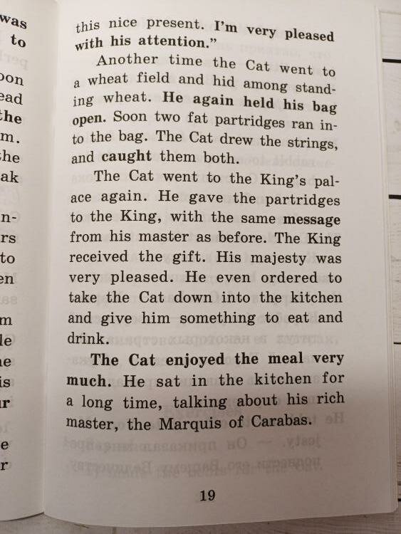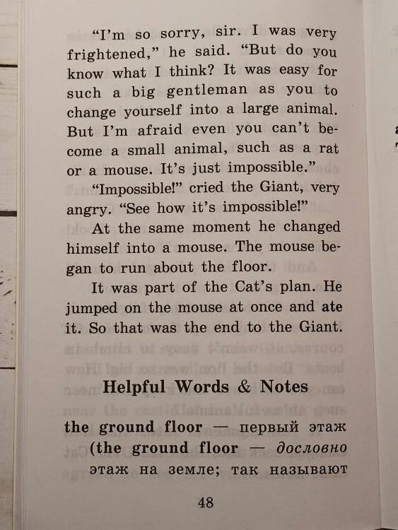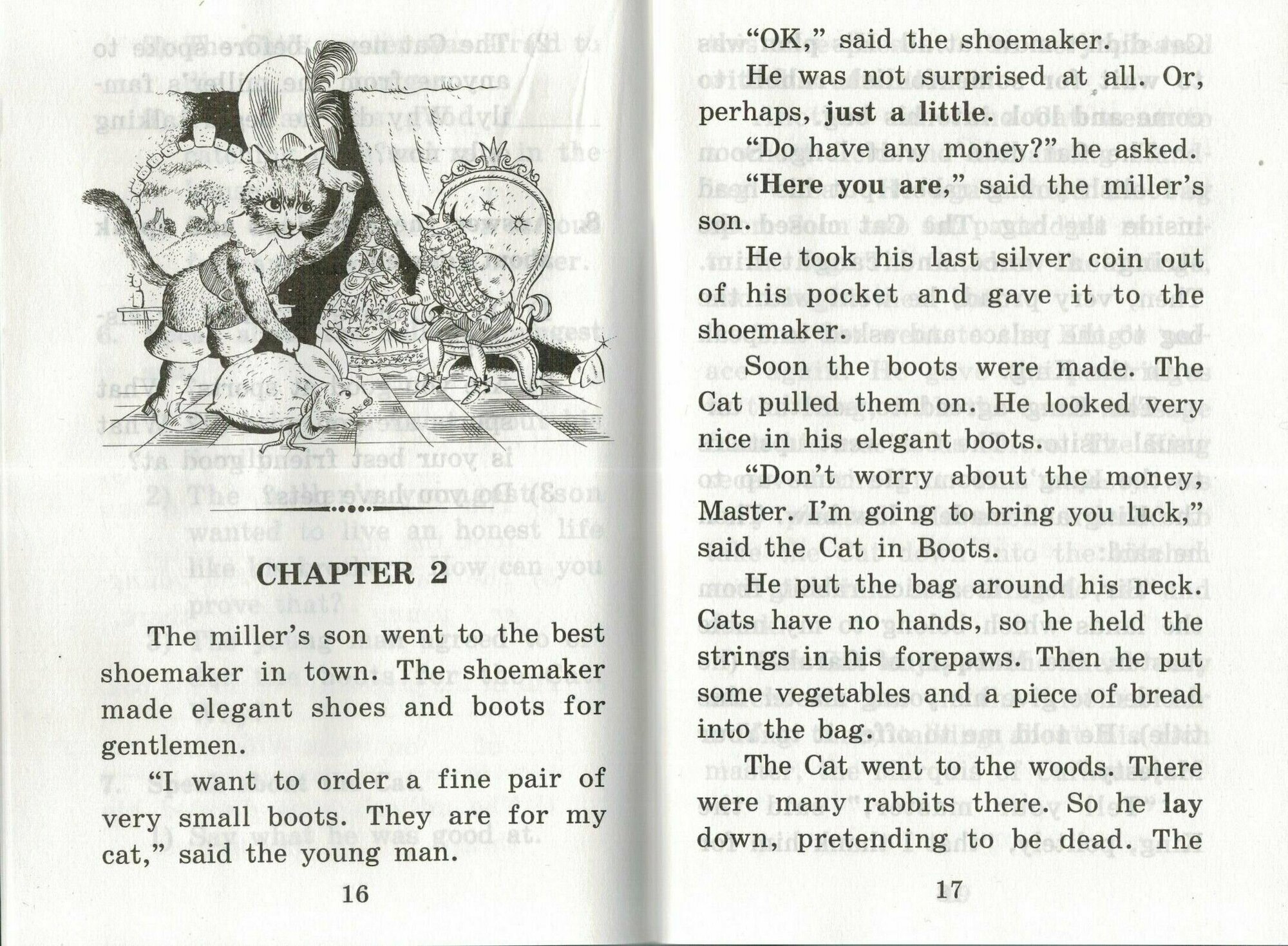 Книга представляет собой пересказ знаменитой сказки французского писателя Шарля Перро "Кот в сапогах" на английском языке. Главный герой сказки – отважный и предприимчивый кот, который помогает своему хозяину достичь успеха и благополучия и завоевать сердце прекрасной принцессы. Текст пособия адаптирован в учебных целях до уровня Beginner. Каждая глава сопровождается переводом новых слов и трудных выражений, а также упражнениями, направленными на проверку понимания текста, расширение лексического запаса, отработку грамматических конструкций и развитие навыков устной речи. В конце книги помещен англо-русский словарь. Пособие адресовано учащимся 3-4 классов школ, гимназий и лицеев.