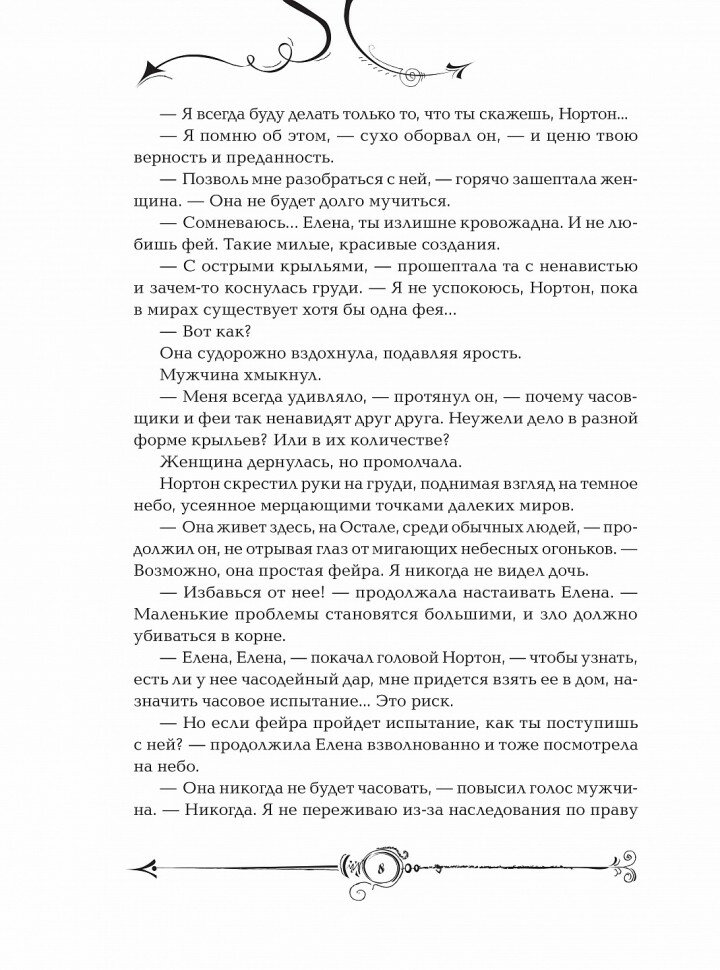Понравилась идея мира с часовой магией, да и вообще идея с часовыми стрелами вместо палочек ещё не встречалась. Интересные герои с разными характерами, забавно наблюдать между ними конфликты. Да, что особо впечатлило – идея крылатого боя (дерутся острыми крыльями). В финале интересный ход с ключами – получилось особенно неожиданно. -