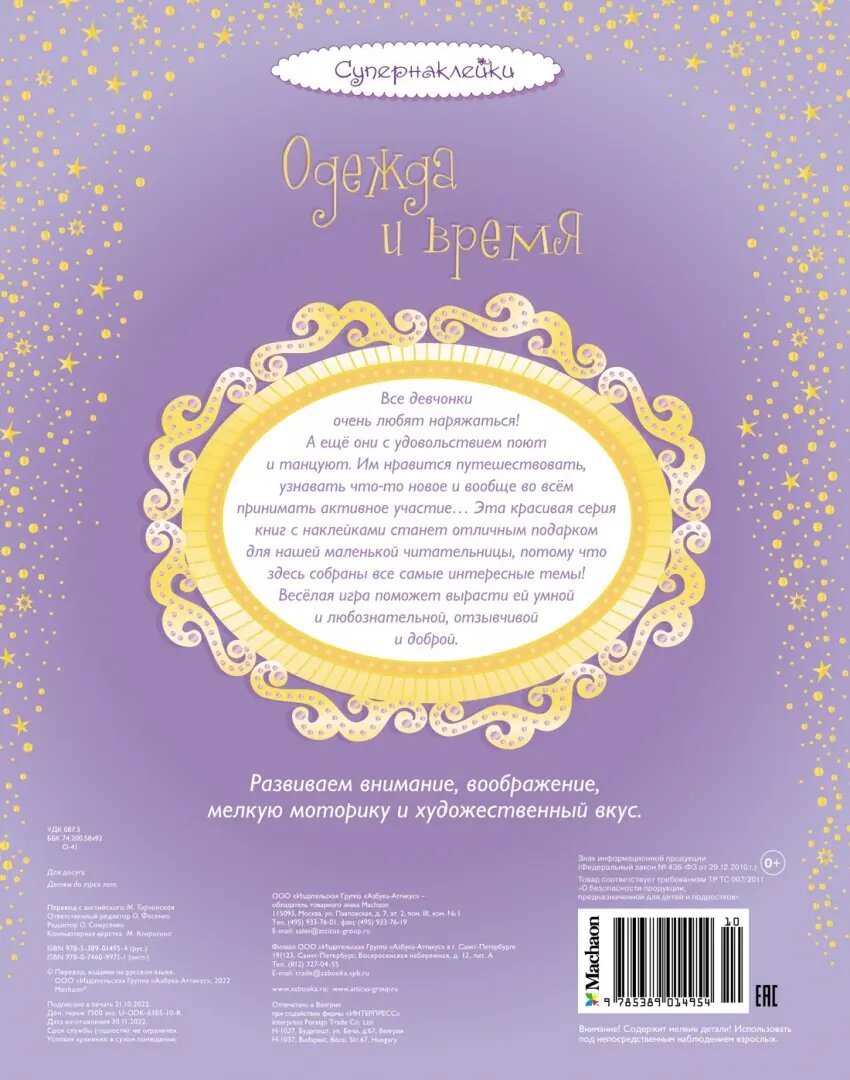Отличная книга для девочки лет 4 и старше. Мы с дочкой впервые стали заниматься на отдыхе. Несколько часов клеили взахлеб и читали. Я для себя узнала много нового об одежде эпох: древний Египет, Древний Рим, Древний Китай, Средневековая Европа, Ренессанс, Роккоко, Ампир, Модерн, Ар-Деко, Оп-Арт, Рок-н-Ролл, наше время. Отличное поучительное пособие, с помощью которого развивается и память и прививается вкус и расширяется кругозор. и кроме того это отличный подарок!!!