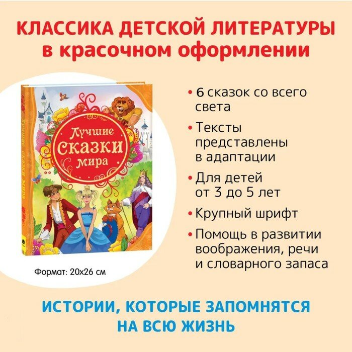 Книга «Лучшие сказки мира» распахнет перед маленьким читателем двери в удивительный мир приключений, небылиц и волшебных историй, которые останутся в памяти на всю жизнь. Издание станет прекрасным подарком малышу и верным спутником в часы досуга: познакомит с культурным наследием разных стран и народов и поможет развить фантазию и воображение.