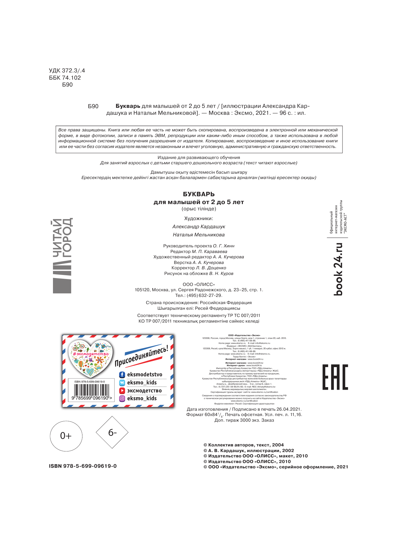 На сегодняшний день товар «Книга: Букварь для малышей от двух до пяти (Кардашук Александр Викторович (художник), Дегтярёва Т.); ООО "Издательство "Эксмо", 2002» можно купить с кешбеком в 4 магазинах: book24, Яндекс.Маркет, Читай-город, Буквоед