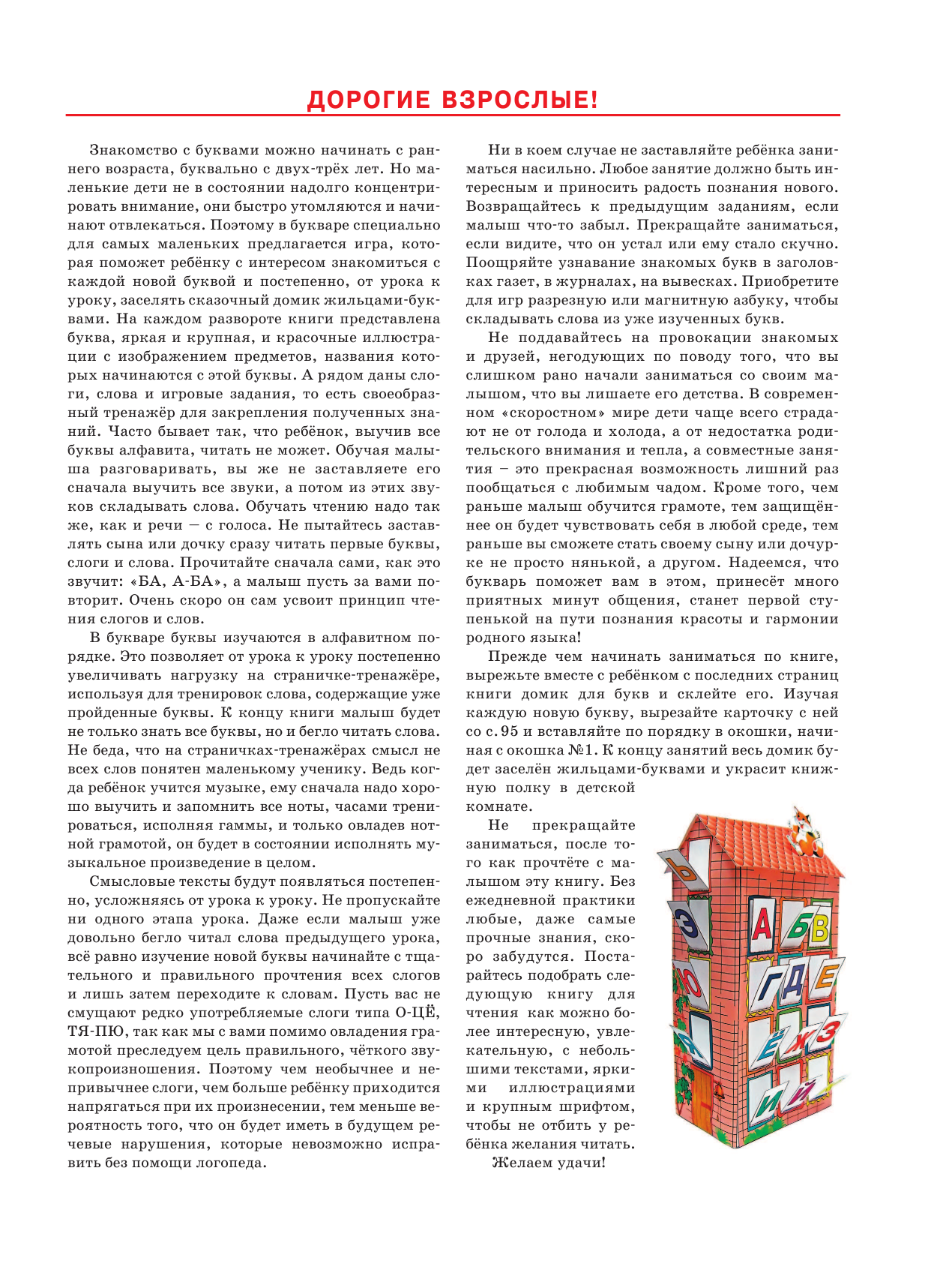 Знакомство с буквами можно начинать с раннего возраста. Но маленькие дети не в состоянии надолго концентрировать внимание, они быстро утомляются и начинают отвлекаться. Поэтому в букваре специально для самых маленьких предлагается игра, которая поможет ребёнку с интересом знакомиться с каждой новой буквой и постепенно, от урока к уроку, заселять сказочный домик жильцами-буквами. На каждом развороте книги представлена буква, яркая и крупная, и красочные иллюстрации с изображением предметов, названия которых начинаются с этой буквы. А рядом даны слоги, слова и игровые задания, то есть своеобразный тренажёр для закрепления полученных знаний.