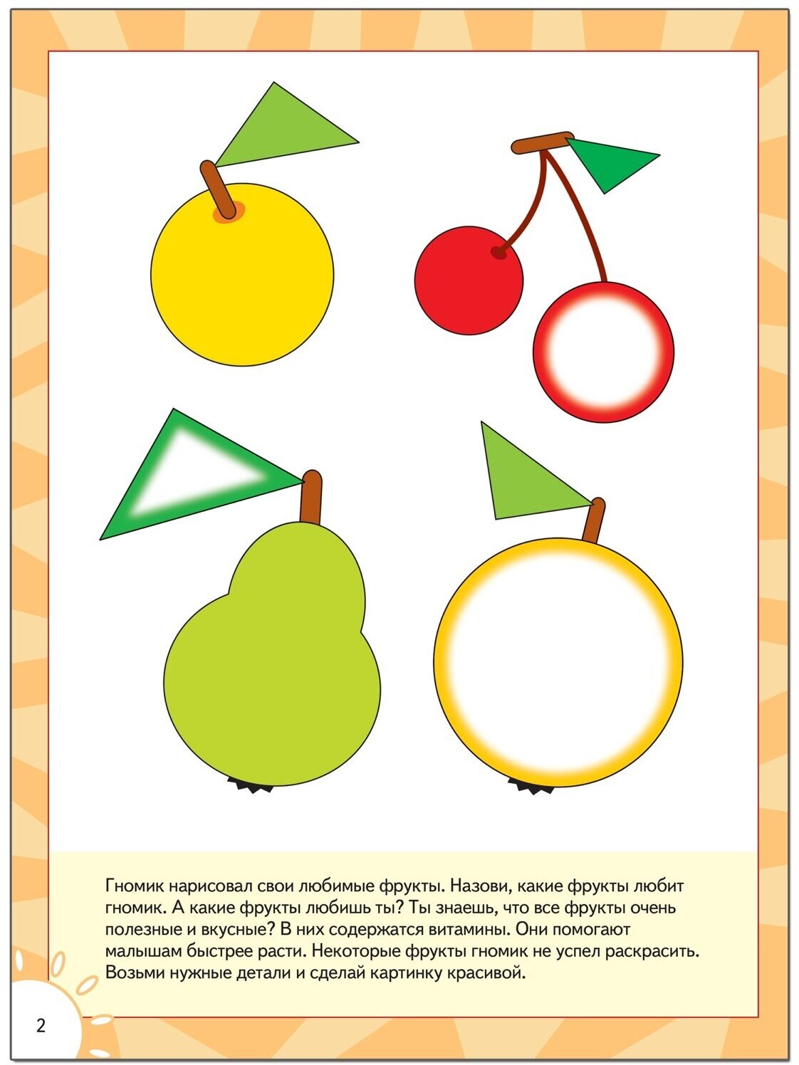 Работая по этой книжке – раскрашивая рисунки, вырезая и наклеивая недостающие фигурки, отвечая на вопросы, малыш сможет увидеть привычные предметы через призму новых для него понятий: "цвет", "форма", "величина".