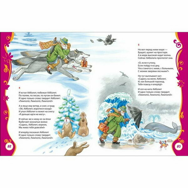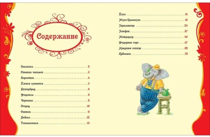 В книгу вошли популярные произведения детского писателя: сказки "Муха-Цокотуха", "Тараканище", "Телефон", "Мойдодыр", "Федорино горе", "Краденое солнце", "Айболит", "Бармалей": стихи "Чудо-дерево", "Обжора", "Закаляка", "Ёжики смеются", "Верблюдица" и другие, а также загадки. Яркие иллюстрации на каждой странице. Крупный шрифт. Иллюстрации И. Якимовой, С. Набутовского.
