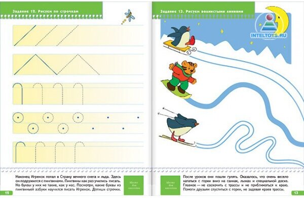 Книжки "Прописи для малышей"от "Школы семи гномов" на развитие мелкой моторики рук направлено каждое из увлекательных занятий: дорисуй картинку, закрась рисунок, обведи «буквы» необычайной пингвиньей азбуки и многие другие.