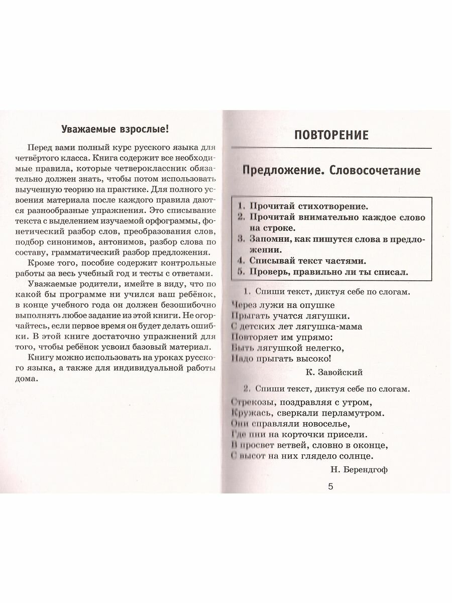 Помощник для учителя и родителей.Книга представляет собой большой и очень подробный сборник заданий для 4 класса (иногда даже избыточный, так как включает задания про второстепенные члены предложения: обстоятельства, определения и дополнения). Задания продуманы и сформированы таким образом, что позволяют учителю быстро подготовить карточки для организации фронтальной работы или проверки учащихся. Текстовый материал очень хороший, например, в теме «сложное предложение» есть такое предложение для тренировки «Перед тобой смолкают водопады и отступает ледяная мгла.» Оно одновременно и простое для разбора, но при этом красиво и развивает речь учеников.