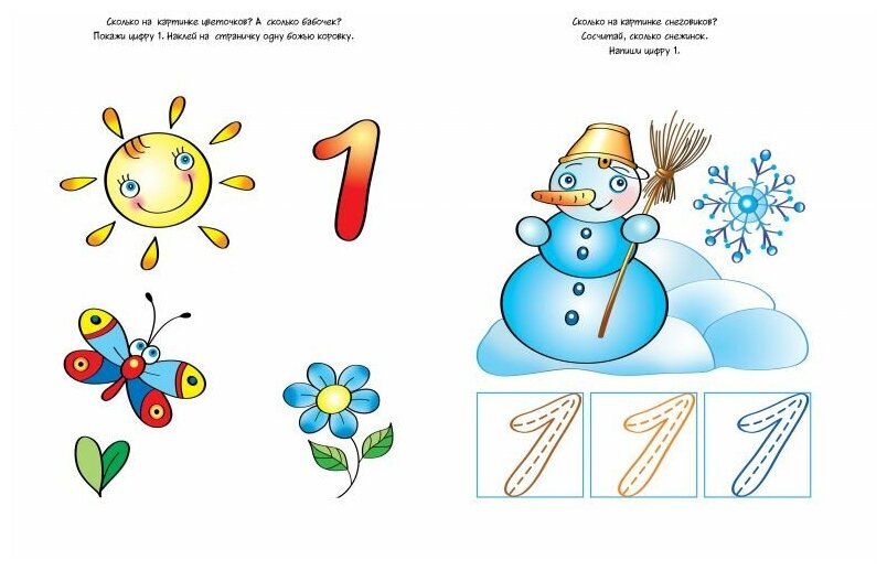Книжечка очень понравилась. помимо обучению счету и основным геометрическим фигурам: круг, квадрат, треугольник, это пособие учит логически мыслить, группировать предметы по признакам. Задания в виде "На картинке нарисованы один лев, одна черепаха и одна пальма. Сколько всего животных рядом с пальмой?"или" Наклей на красную салфетку одну конфетку, на зеленую - две, на синюю - три конфеты." достаточно сложные и интересные, способные развить интеллект и внимательность.Очень рекомендую!
