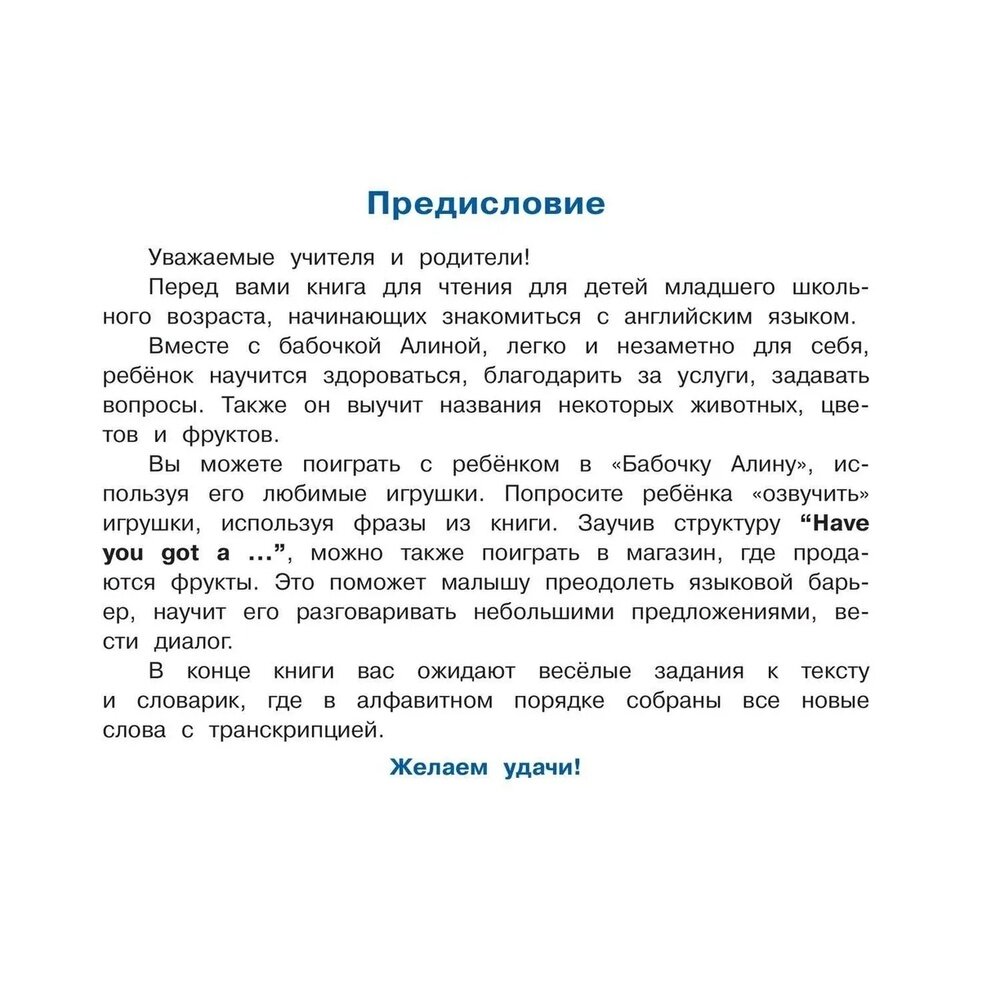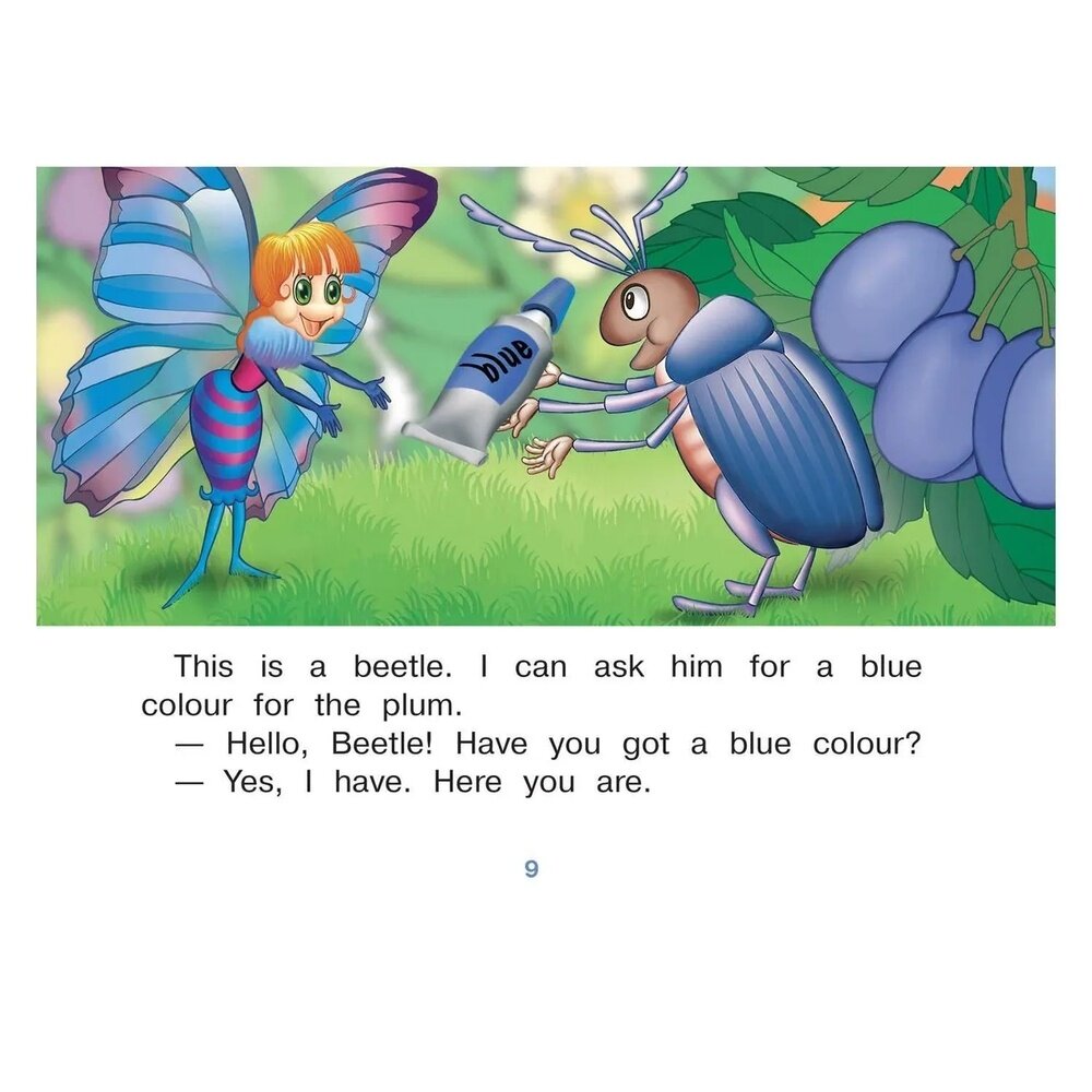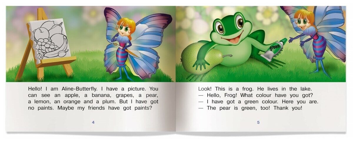 .Бабочка Алина отправляется на поиски красок для своей картины, и в этом ей помогают ее верные друзья. Герои этой истории научат ребенка здороваться, благодарить за услуги, задавать вопросы. Также он выучит названия некоторых животных, цветов и фруктов. Завершают книгу веселые задания к тексту и словарик, где в алфавитном порядке собраны все новые слова с транскрипцией.