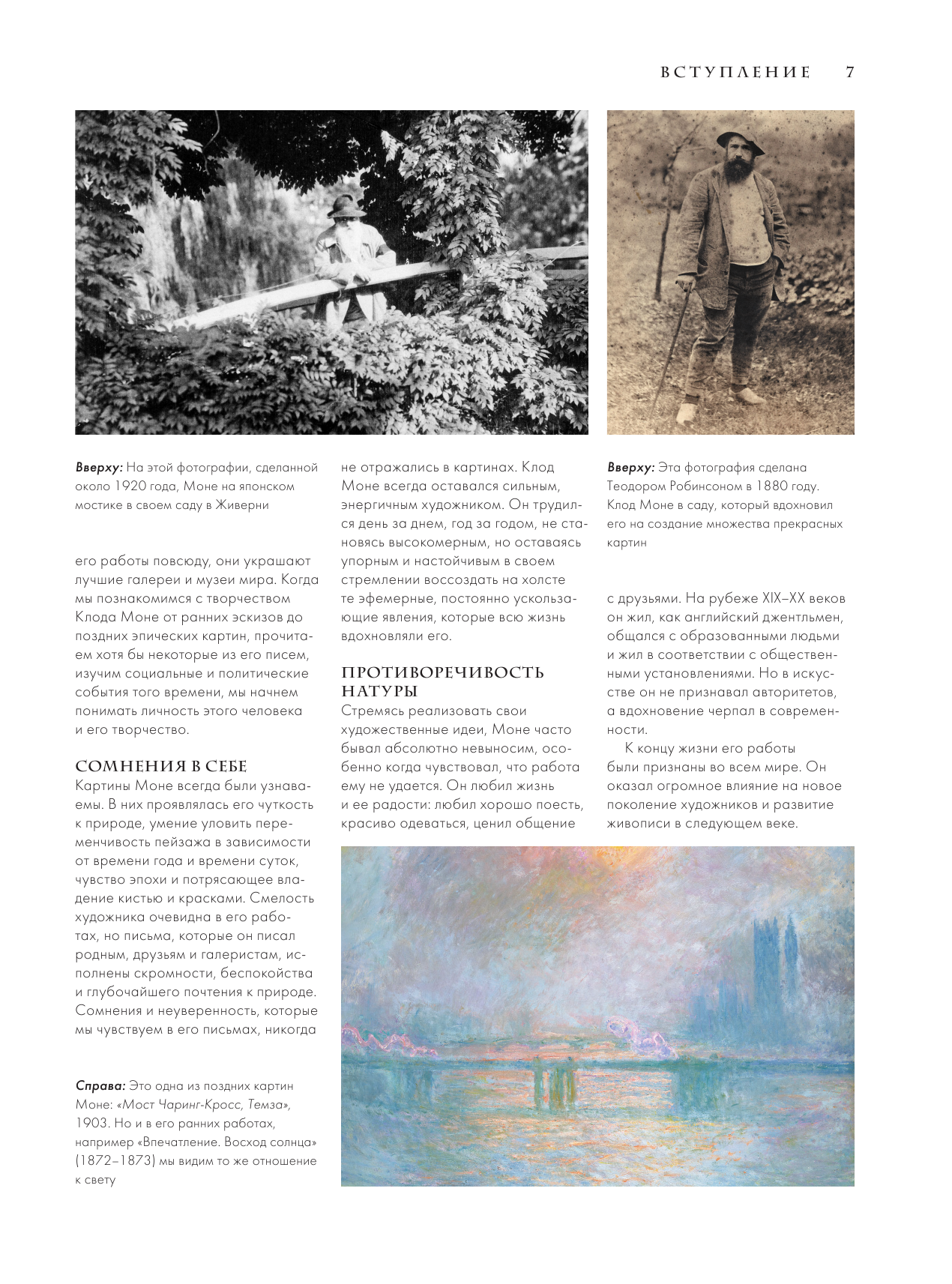 Альбом поделен на 2 части. Первая - биография художника. Информация преподнесена доступно, легко, а главное интересно. Читатели узнают какие испытания выпали на долю Моне, с кем дружил, кого любил, где черпал вдохновение, проследят развитие таланта. Для меня было, например, шоком узнать, что в старости у художника были проблемы со зрением, он почти ослеп. Вторая часть - галерея, очень обширное собрание! К каждой картине есть комментарий. Вот смотрю на подписи, бывает что написано "частное собрание". Это ж какое счастье обладать таким сокровищем! Невообразимо!!!