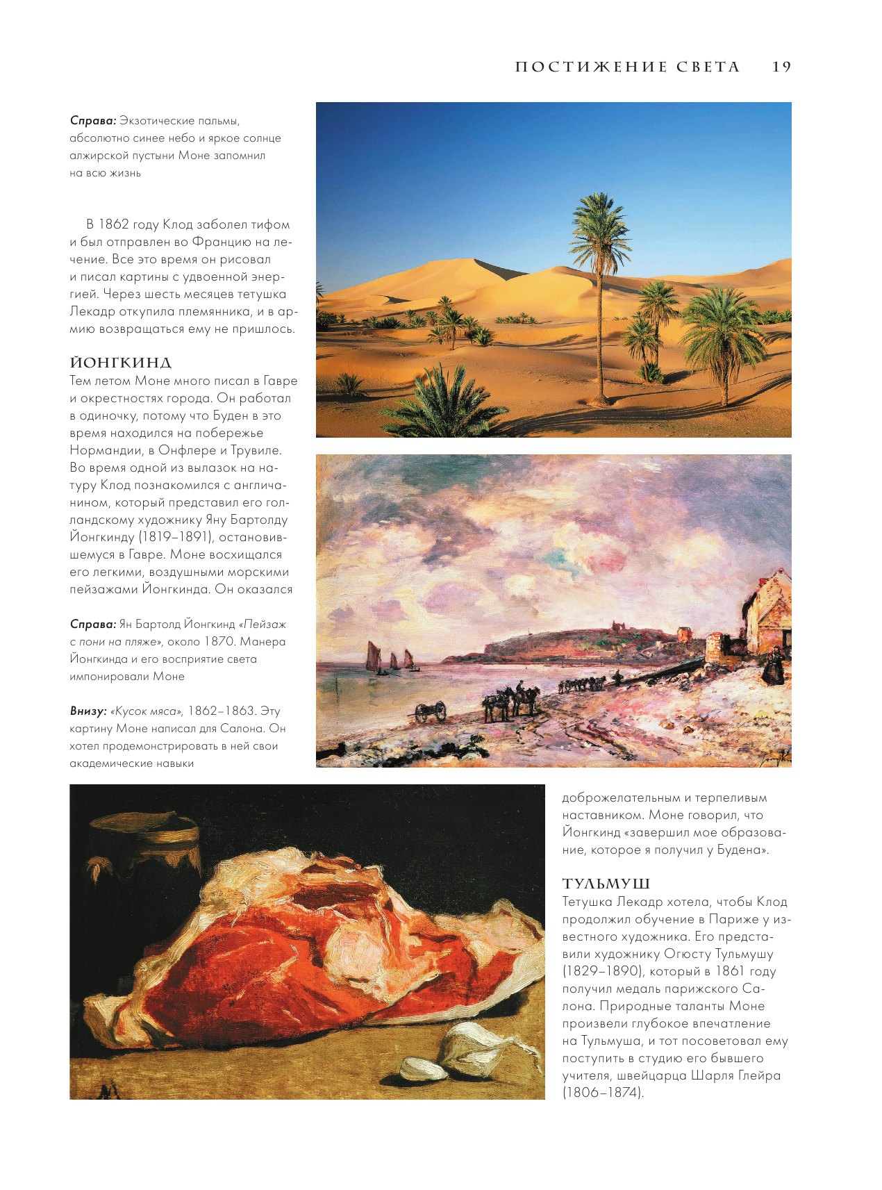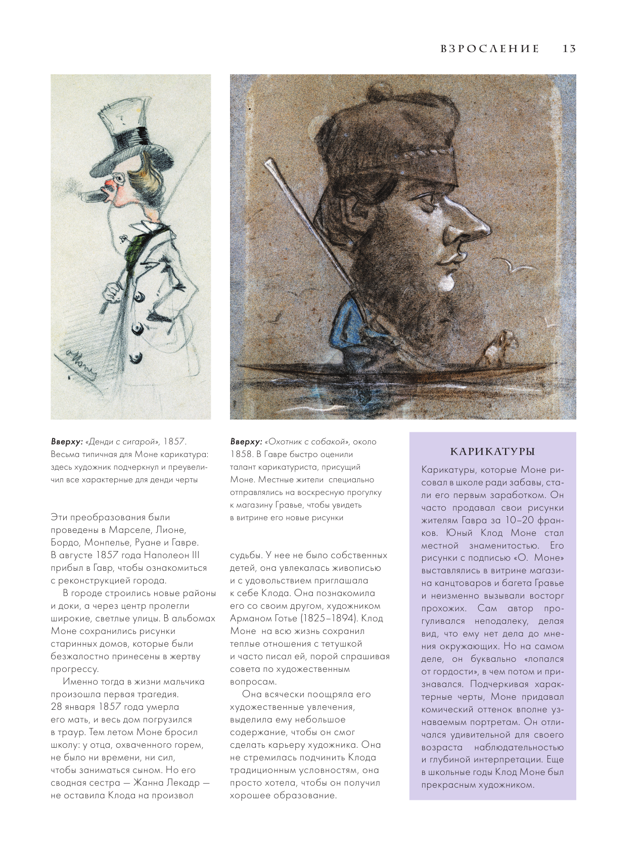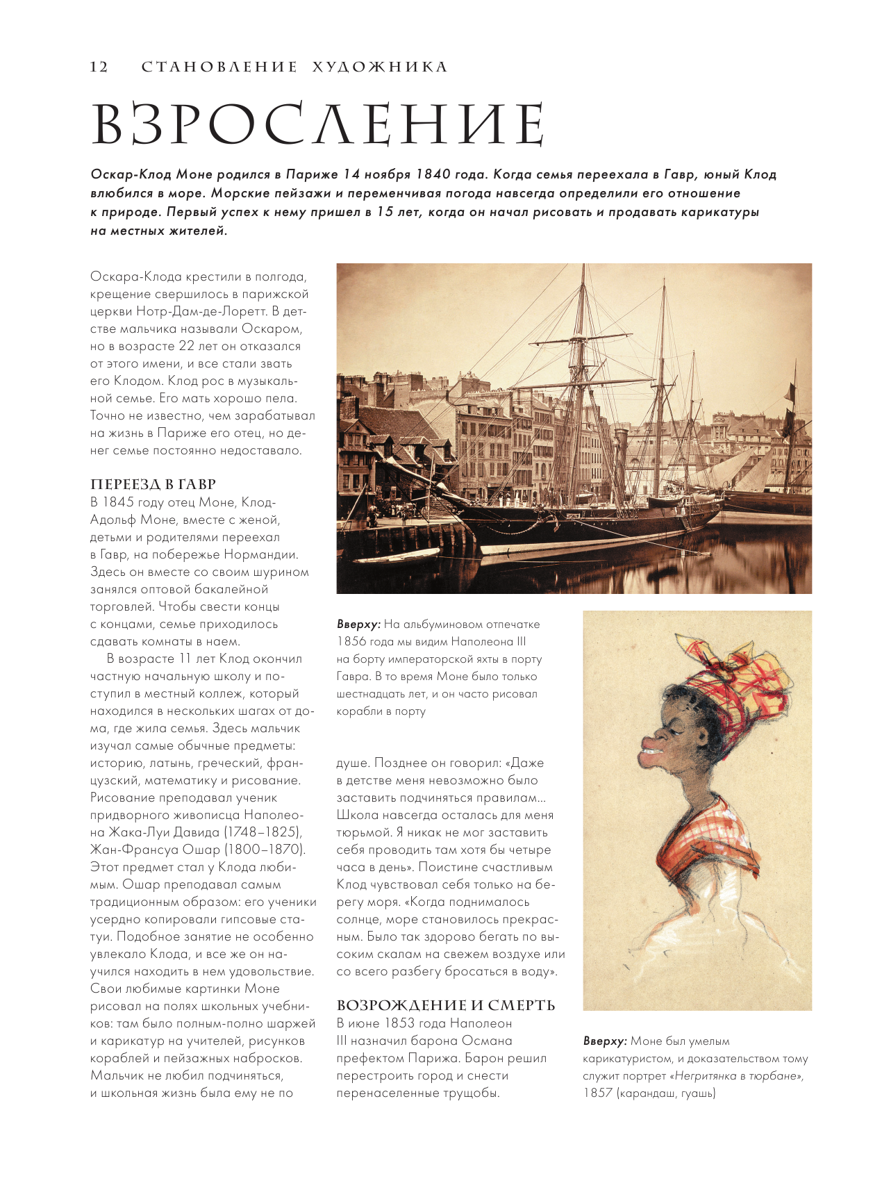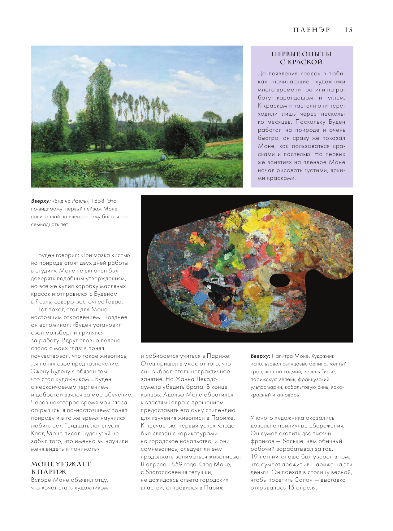 Единственное, биографическая часть книги мне не особо понравилась (может просто потому, что ожидала несколько другого подхода) – она такая, такая… скажем, «фактическая». В свете этого эпитета в тексте все вполне гармонично – выставка импрессионистов номер один (факт), Моне выставил в ней столько-то картин (факт), потом поехал туда – нарисовал там то-то и то-то – и вернулся сюда (факты), еще одна выставка с таким-то количеством картин (факт). Для главы «биография в датах и фактах» - все очень здорово, но мне этого в таком виде знать о художнике вовсе и не нужно, я не статистик (тем более после прочтения никто не вспомнит этих данных, ведь по сути они не релевантны). А вот то, что Моне чувствовал и думал, какие у него были личные отношения с друзьями-импрессионистами и женщинами, которых он любил