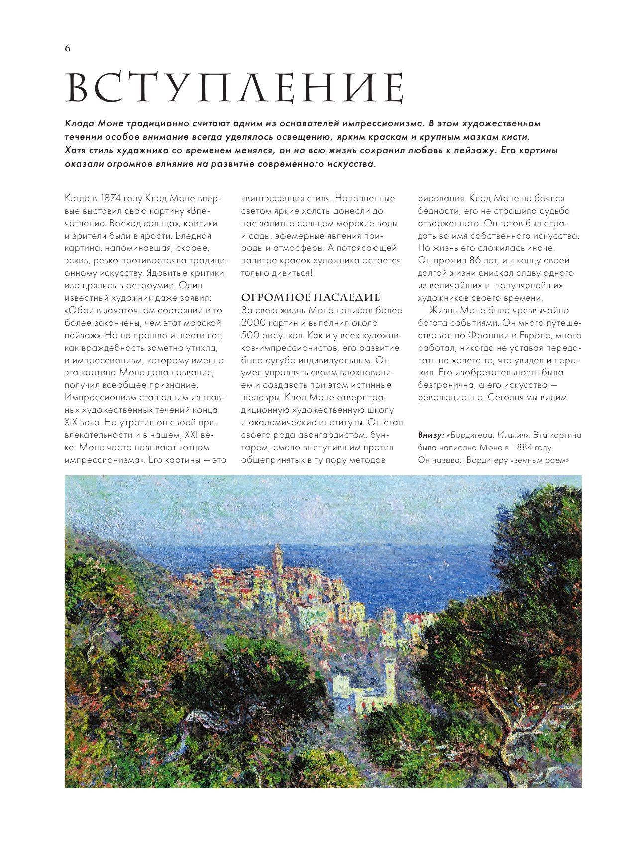 Эта книга о жизни и творчестве Клода Моне - французского живописца-пейзажиста, одного из основателей импрессионизма. Трепетные воздушные образы картин Моне пронизаны любовью к жизни и призваны продлить мимолетность восторга, остановить мгновенье. Художники-импрессионисты - Клод Моне и круг его сподвижников: Эдуард Мане, Альфред Сислей, Огюст Ренуар - через преодоление консервативных правил академической живописи пришли к рождению нового стиля в искусстве и доказали, что впечатление от произведения гораздо важнее, чем слепое следование канонам.