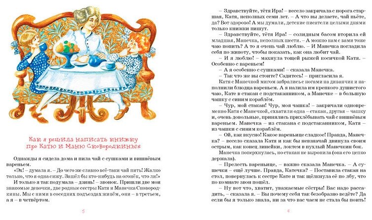Однажды Катя и Манечка Сковородкины пришли на чай с вареньем и сушками к своей соседке тёте Ире, детской писательнице, и стали её упрашивать написать про них книжку. Так и появилась эта замечательная повесть про двух забавных, так непохожих друг на друга сестричек. Катя с Маней уже всему двору её показали, и всем она понравилась, даже вредной Нинке Кукушкиной. Познакомьтесь со Сковородкиными и вы. Обещаем, будет очень весело!