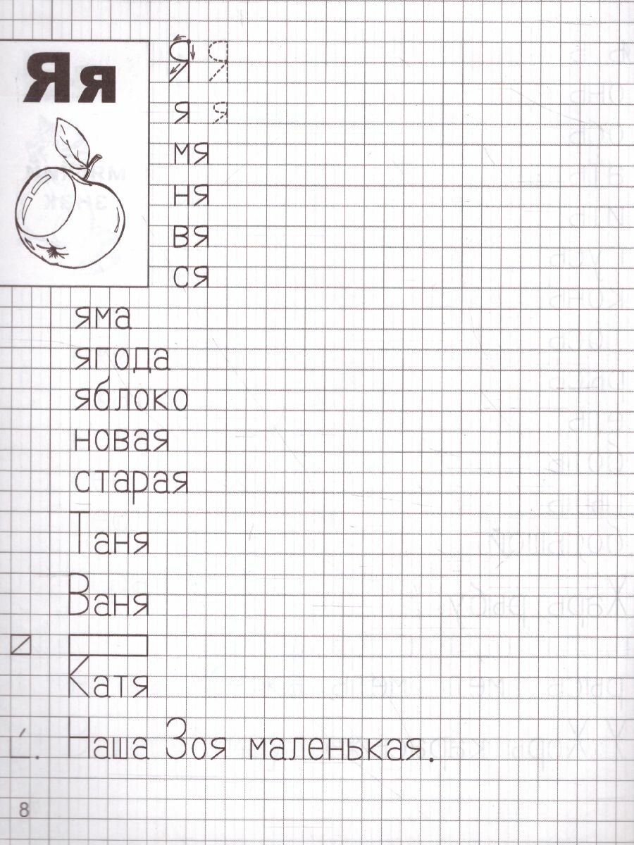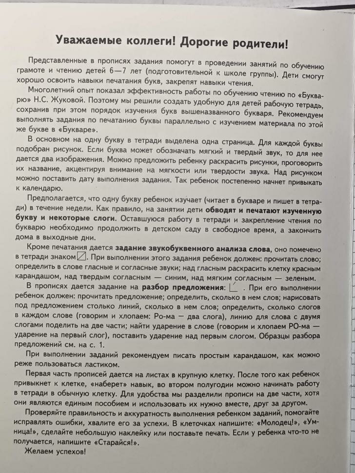 "Прописи помогут детям 6-7 лет узнать грамоту, научиться ""печатать"" буквы русского алфавита. В прописях предложены задания на звукобуквенный анализ слова и навыки разбора слов и предложений. Кроме того, выполняя задания, ребенок подготовит руку к письму в школе, разовьет навыки работы с тетрадью, внимание и память. Порядок букв соответствует порядку ""Букваря"" Н.С.Жуковой.