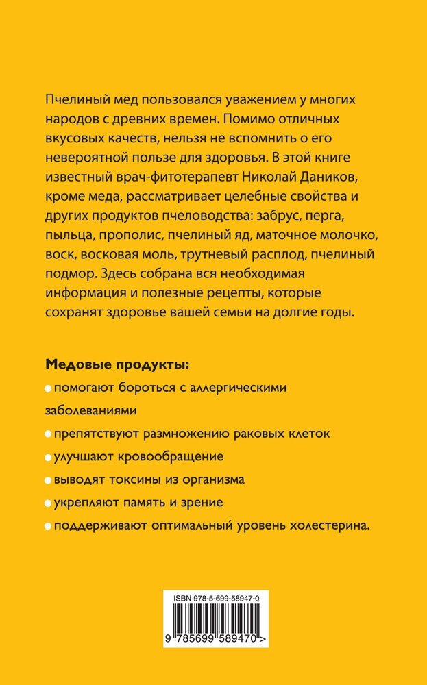 В этой книге известный врач-фитотерапевт Николай Даников рассматривает уникальные лечебные свойства меда и других предметов пчеловодства: забруса, перги, пыльцы, прополиса, пчелиного яда, маточного молочка, воска, восковой моли, трутневого расплода, пчелиного подмора. Вы узнаете, как с помощью этих продуктов укрепить иммунитет, предотвратить образование раковых клеток, очистить организм, улучшить кровообращение, поддержать оптимальный уровень холестерина и пр. Здесь собрана вся необходимая информация и полезные рецепты, которые сохранят здоровье вашей семьи на долгие годы.