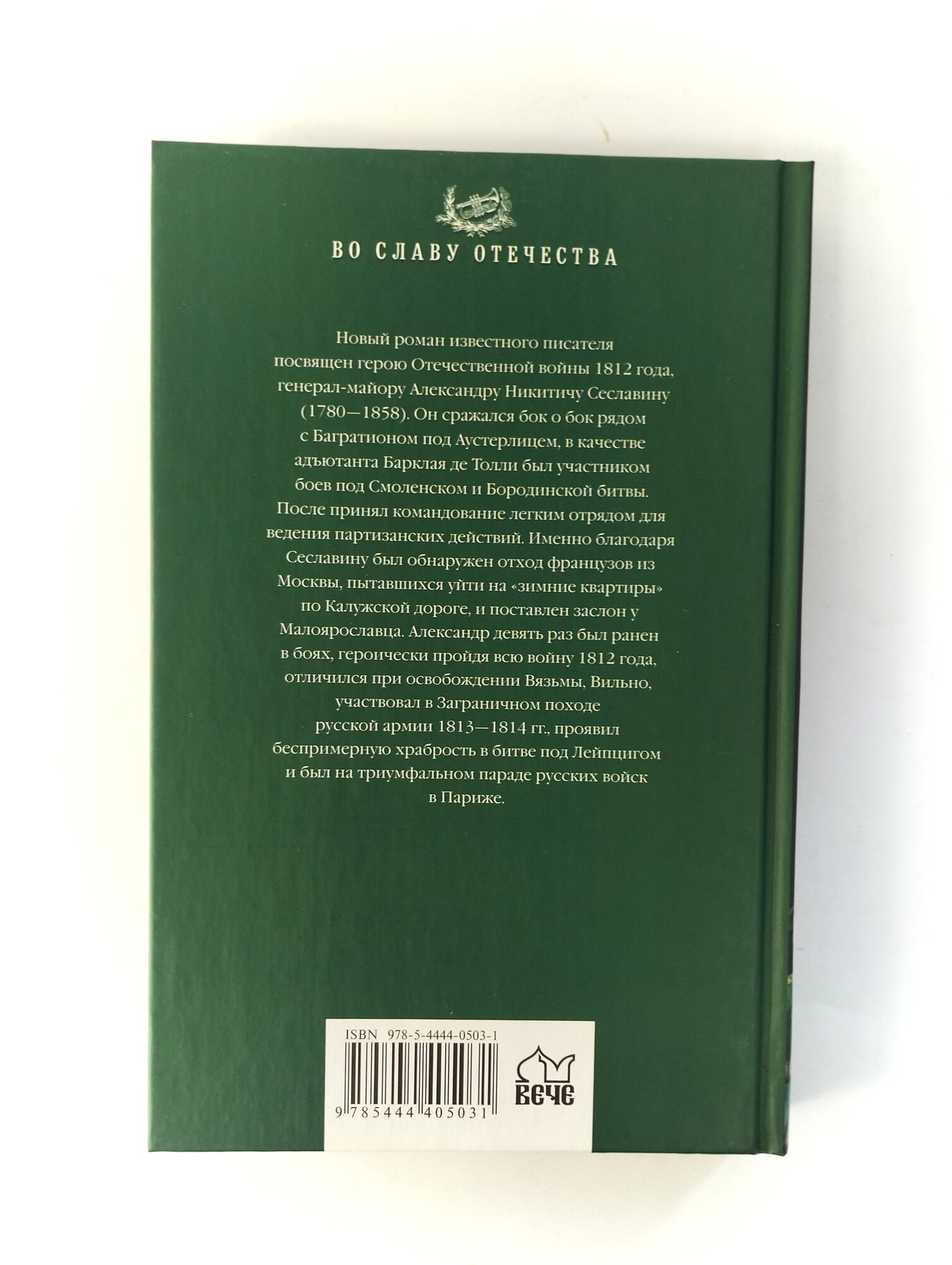 Новый роман известного писателя посвящен герою Отечественной войны 1812 года, генерал-майору Александру Никитичу Ссславину (1780— 1858). Он сражался бок о бок рядом с Багратионом под Аустерлицем, в качестве адъютанта Барклая де Толли был участником боев под Смоленском и Бородинской битве. После принял командование легким отрядом для ведения партизанских действий. Имешю благодаря Сеславину был обнаружен отход французов из Москвы, пытавшихся уйти на «зимние квартиры» по Калужской дороге, и поставлен заслон у Малоярославца. Александр девять раз был ранен в боях, героически пройдя всю войну 1812 года, отличился при освобождении Вязьмы, Вильно, участвовал в Заграничном походе русской армии 1813—1814 гг., проявил беспримерную храбрость в битве под Лейпцигом и был на триумфальном параде русских войск в Париже.