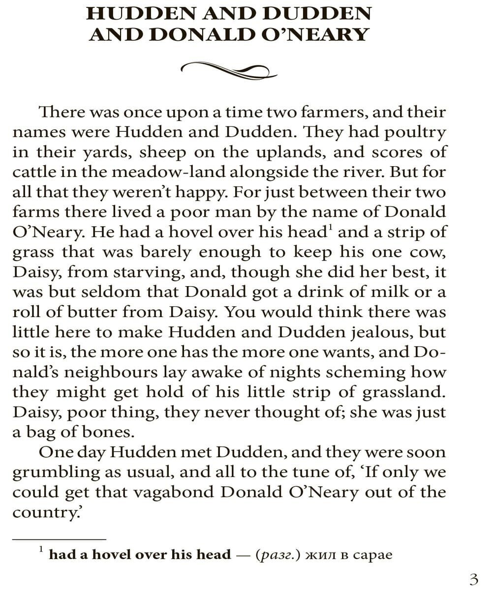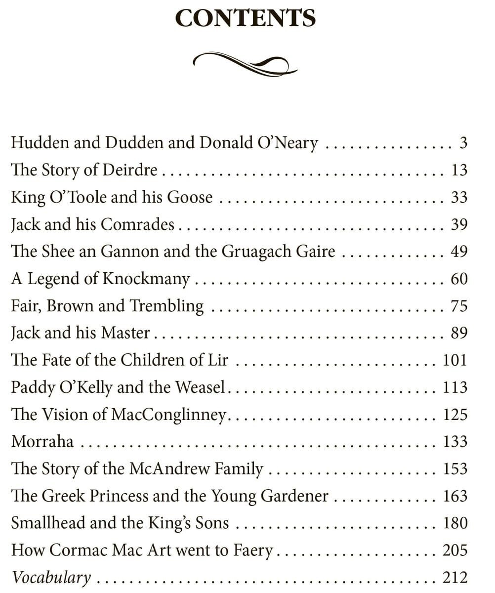 Отличное карманное издание, вобравшее в себя прекрасный ирландский фольклор. Состоит из 16-ти сказок длиной 10-20 страниц: "Hudden and Dudden and Donald O'Neary", "The Story of Deirdre", "King O'Toole and His Goose", "Jack and His Comrades", "The Shee an Gannon and the Gruagach Gaire", "A Legend of Knockmany", "Fair, Brown, and Trembling", "Jack and His Master", "The Fate of the Children of Lir", "Paddy O'Kelly and the Weasel", "The Vision of MacConglinney", "Morraha", "The Story of the McAndrew Family", "The Greek Princess and the Young Gardener", "Smallhead and the King's Sons", "How Cormac Mac Art went to Faery". В конце дан словарик на 19 стр., в котором в алфавитном порядке дан перевод новых слов, расшифровка сокращений и диалектизмов.
