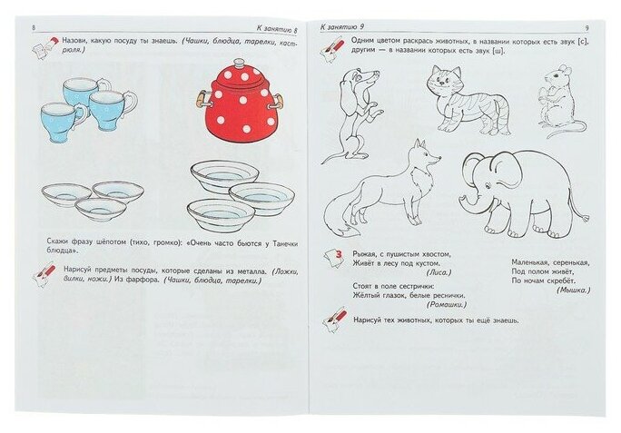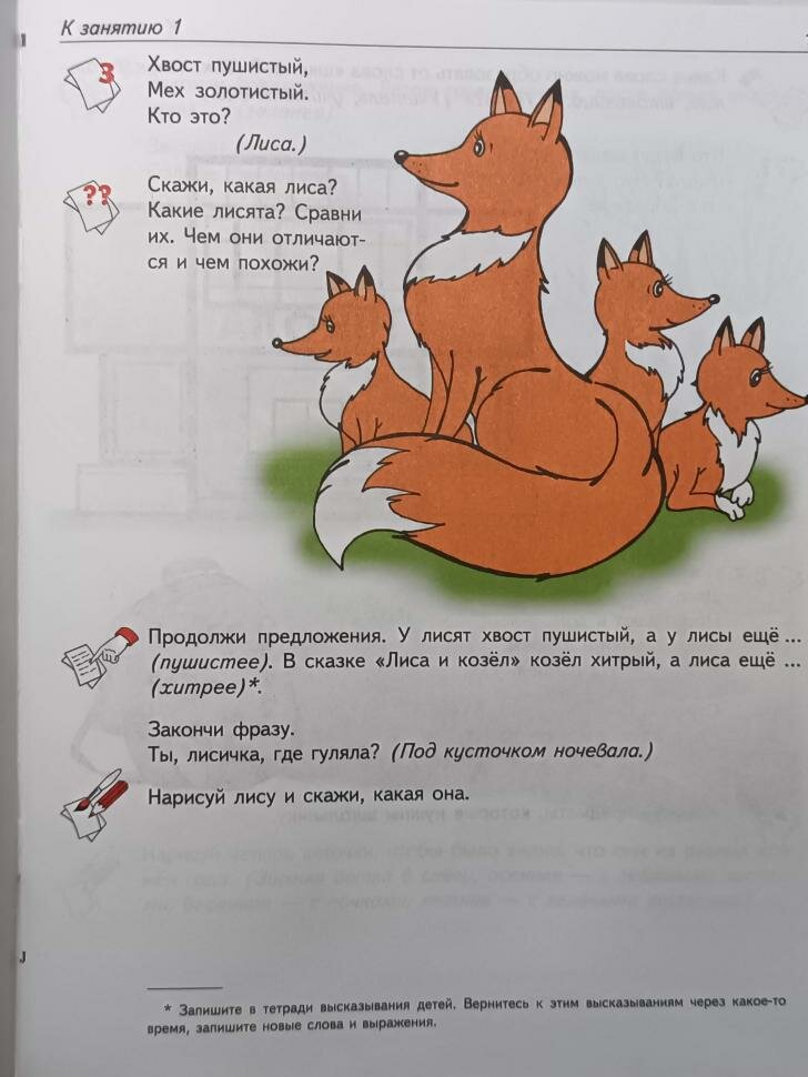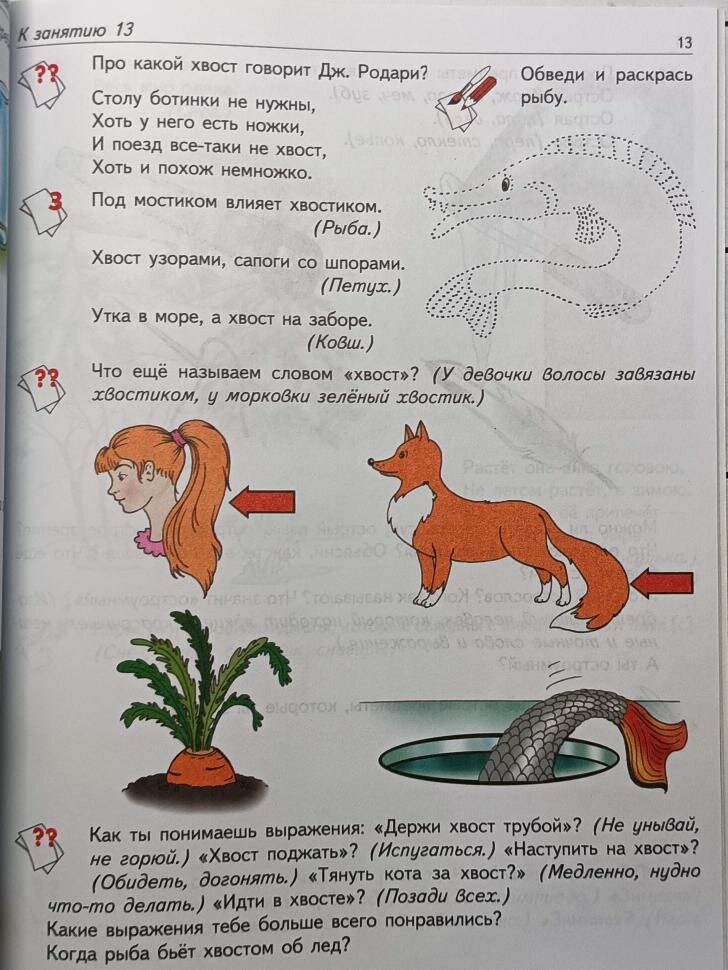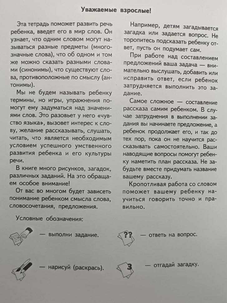 Отличное пособие по развитию речи. В тетради много загадок, фразеологических оборотов, картинок. есть задания на развитие словаря, фонематического слуха, грамматики, связной речи. Автор в доступной для детей форме объясняет переносный смысл устойчивых выражений таких как: "держи хвост трубой"", "хвост поджать", и др. также в тетради много вопросов которые можно задать ребёнку, не нужно ничего придумывать, можно использовать как самостоятельное пособие или добавлять задания в другие занятия.