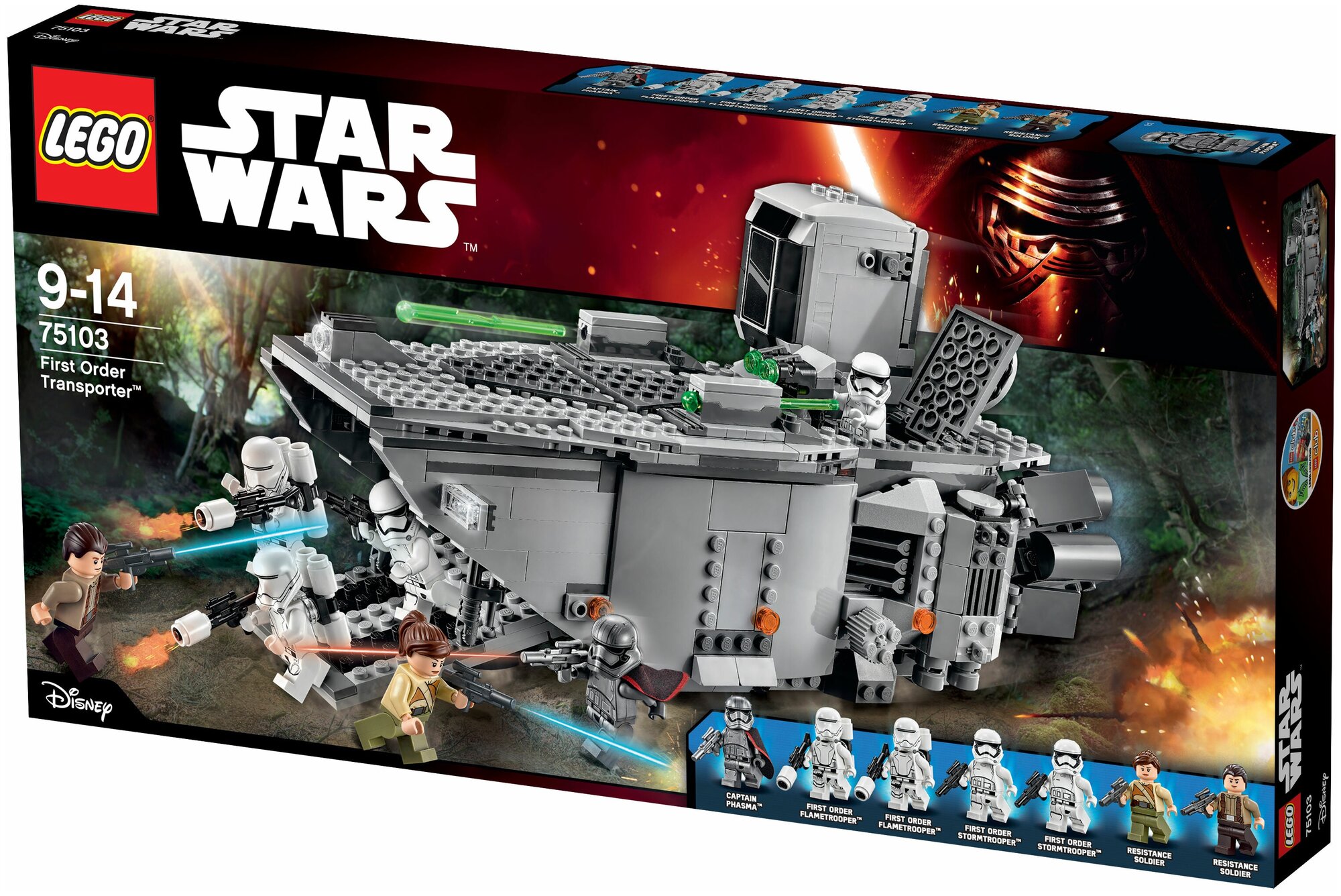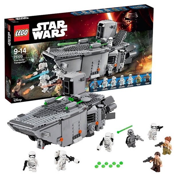 Большой набор из линейки Lego Star Wars, посвященной седьмому эпизоду «Звездных войн». Здесь вы найдете космический корабль Первого порядка – военной группировки, появившейся в «Пробуждении силы».В наборе есть целых семь мини-фигурок: два солдата-повстанца (мужчина и женщина), четыре штурмовика и их предводитель – капитан Фазма в хромированных доспехах. Разнообразен и комплект аксессуаров: боевые заряды для корабля, два огнемета, пять бластеров и два реактивных ранца.
